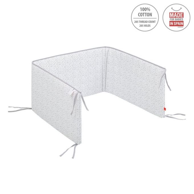 Su cualidad de tener un relleno desenfundable la convierte en una prenda versátil para ser utilizada en invierno y en verano y también ofrece la ventaja de ser lavada con facilidad. El protector fabricado con tejido cuyo interior va acolchado con fibra hueca, amortigua los posibles golpes del bebe contra la cuna.