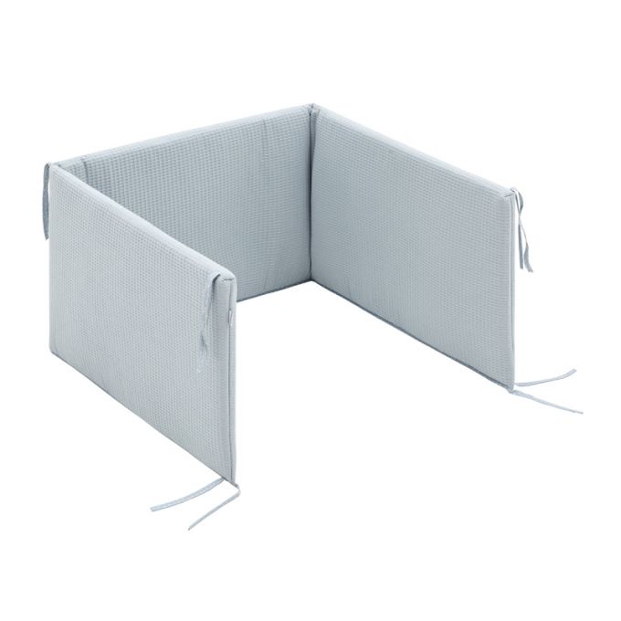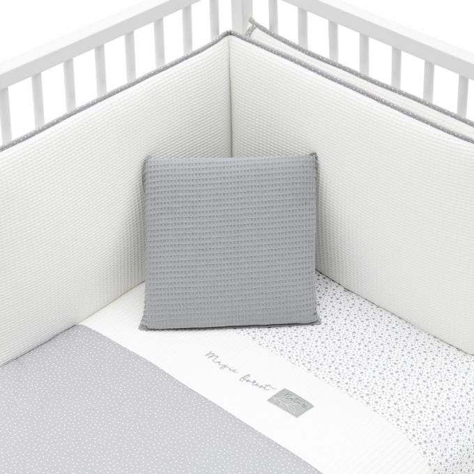 Su cualidad de tener un relleno desenfundable la convierte en una prenda versátil para ser utilizada en invierno y en verano y también ofrece la ventaja de ser lavada con facilidad. El protector fabricado con tejido cuyo interior va acolchado con fibra hueca, amortigua los posibles golpes del bebe contra la cuna.