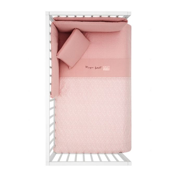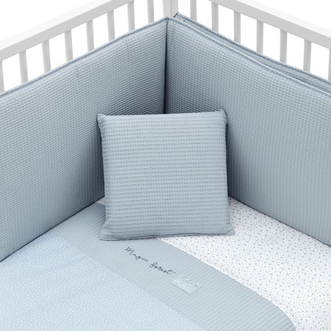 Juego de 2 piezas para vestir la cuna, compuesto por funda nórdica más protector (incluye el relleno) + cojín decorativo. La funda nórdica, es la prenda que viste la cuna y cumple el cometido de protección contra el frío cubriendo a nuestro bebé con una prenda que al incorporar el relleno, la hace especialmente confortable y calidad para sus primeros meses de vida.