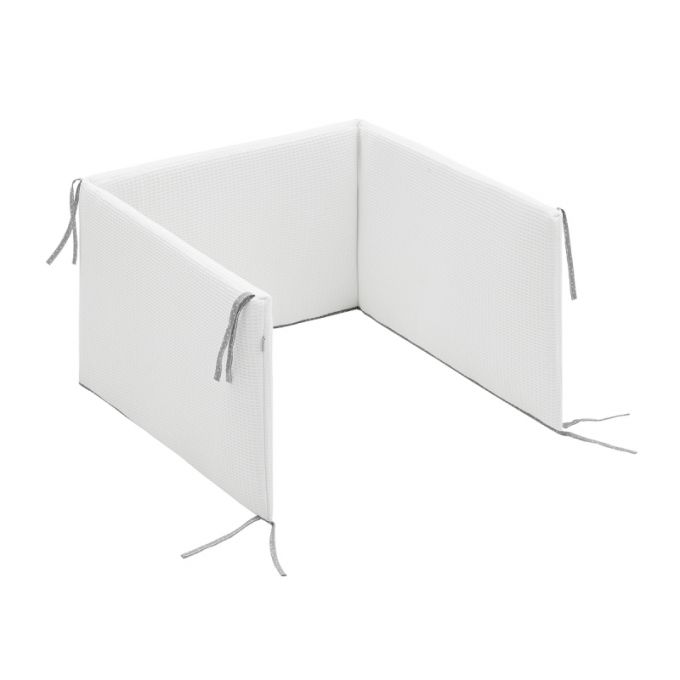 Su cualidad de tener un relleno desenfundable la convierte en una prenda versátil para ser utilizada en invierno y en verano y también ofrece la ventaja de ser lavada con facilidad. El protector fabricado con tejido cuyo interior va acolchado con fibra hueca, amortigua los posibles golpes del bebe contra la cuna.