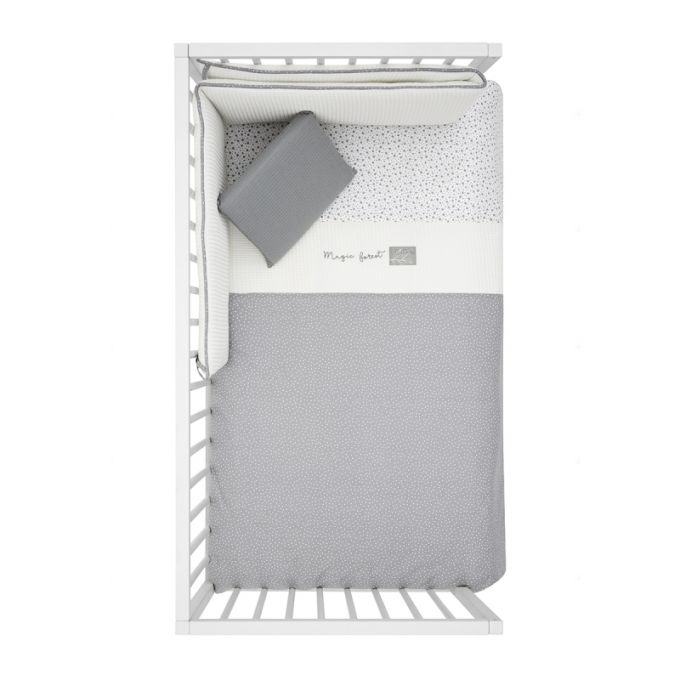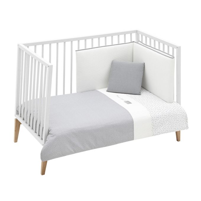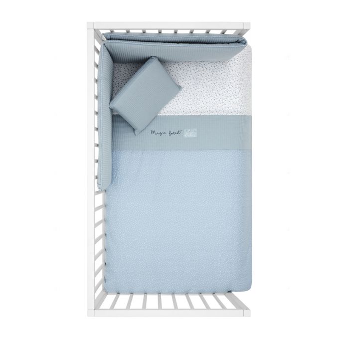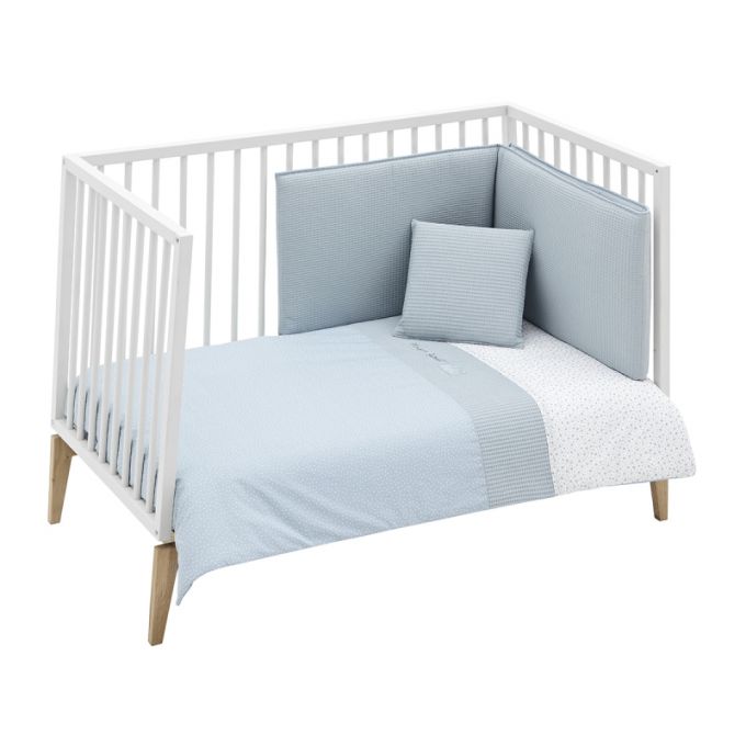 Juego de 2 piezas para vestir la cuna, compuesto por funda nórdica más protector (incluye el relleno) + cojín decorativo. La funda nórdica, es la prenda que viste la cuna y cumple el cometido de protección contra el frío cubriendo a nuestro bebé con una prenda que al incorporar el relleno, la hace especialmente confortable y calidad para sus primeros meses de vida.