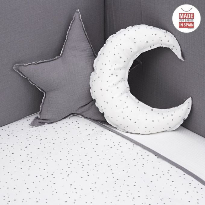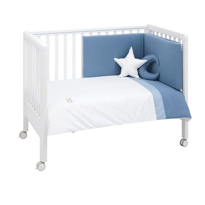 El juego de 4 piezas de cuna de Cambrass, está compuesto por un protector de 3 partes con 8 puntos de agarre a la cuna, un nórdico de algodón que puede ser reversible (el relleno del nórdico está compuesto por fibras que mantienen la temperatura corporal del bebé con una suavidad extrema) y 2 cojines de formas diferentes que a parte de hacer un complemento ideal para la decoración, también los utilizará él bebe una vez vaya creciendo.
