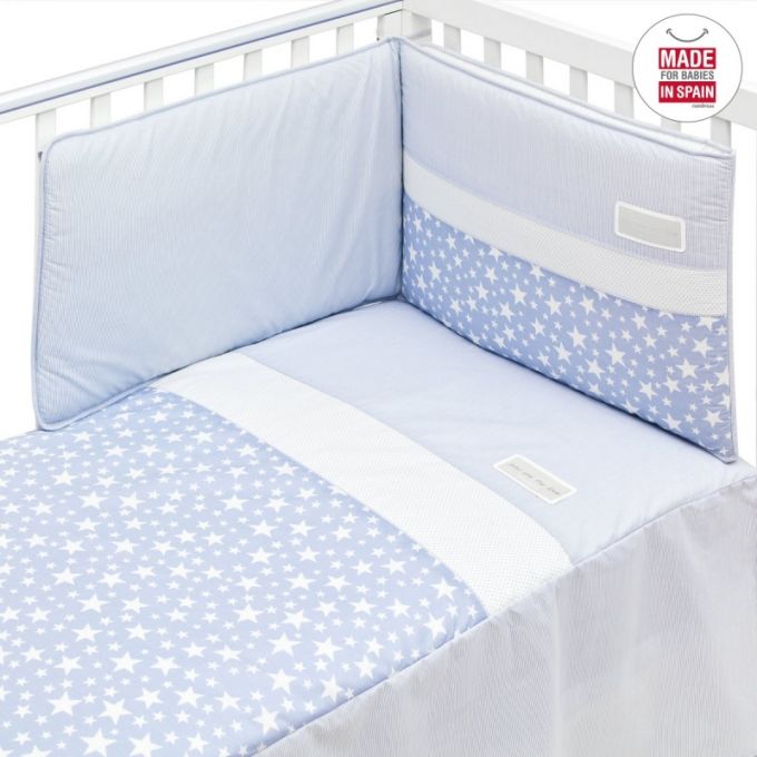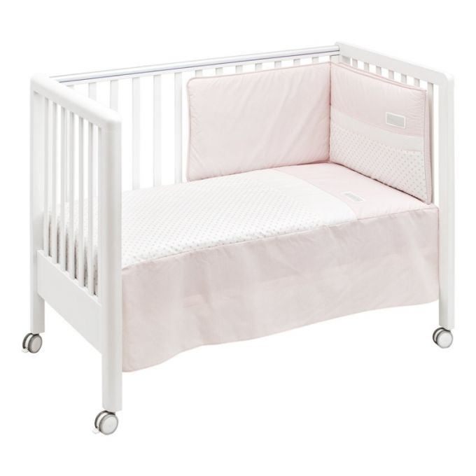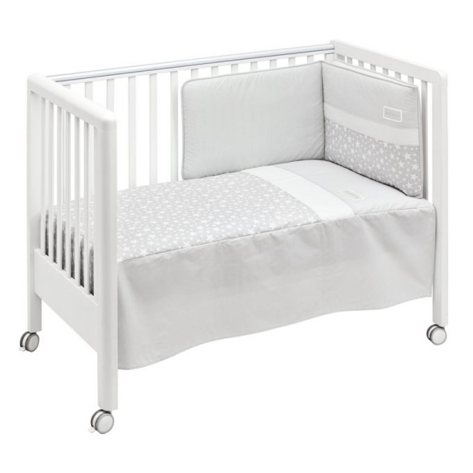 Juego de 2 piezas para vestir la cuna, compuesto por colcha más protector. La colcha, es la prenda que viste la cuna y cumple el cometido de protección contra el frío como si de una manta o una funda nórdica se tratara. Su cualidad de tener un relleno desenfundable la convierte en una prenda versátil para ser utilizada en invierno y en verano y también ofrece la ventaja de ser lavada con facilidad. Dispone de 3 volantes que cumplen la función de vestir la cuna.