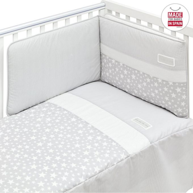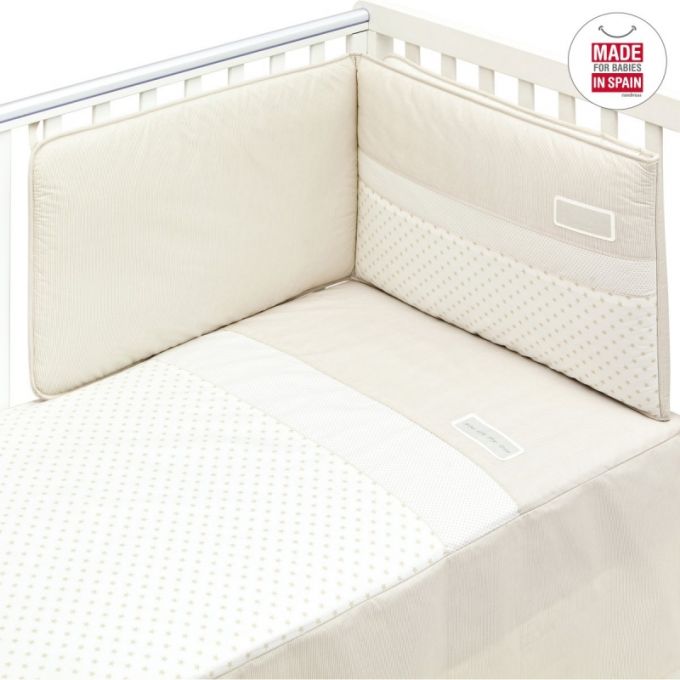 El protector, fabricado con tejido cuyo interior está acolchado con fibra hueca para amortiguar los posibles golpes del bebé contra la cuna, los cuales se producen por los simples movimientos del bebé cuando está dentro de la cuna. Cambrass confecciona este juego de 2 piezas para cunas de 70 x 40 cm.