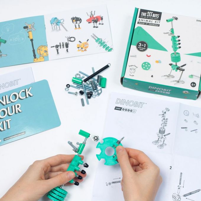 Los Offbits son personajes extravagantes y artilugios de robots creados para ser rediseñados, hechos de trozos y piezas recicladas, impulsados por tu propia creatividad. Cada kit de construcción lleva piezas de distintas formas, colores y tamaños y una Super Herramienta para hacer las construcciones. Sigue las instrucciones visuales y crea tu primer DinoBit, a partir de ahí, ¡deja volar tu imaginación y combínalos como quieras!