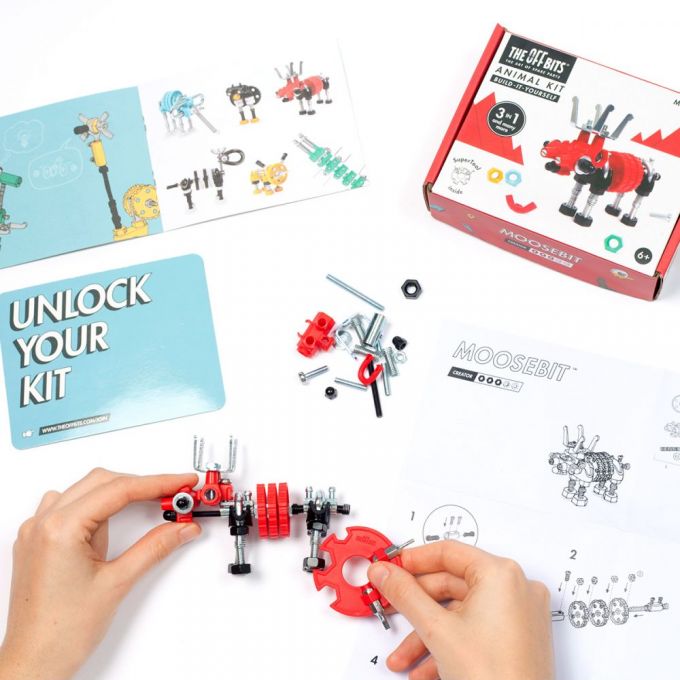 Los Offbits son personajes extravagantes y artilugios de robots creados para ser rediseñados, hechos de trozos y piezas recicladas, impulsados por tu propia creatividad. Cada kit de construcción lleva piezas de distintas formas, colores y tamaños y una Super Herramienta para hacer las construcciones. Sigue las instrucciones visuales y crea tu primer MooseBit, a partir de ahí, ¡deja volar tu imaginación y combínalos como quieras!