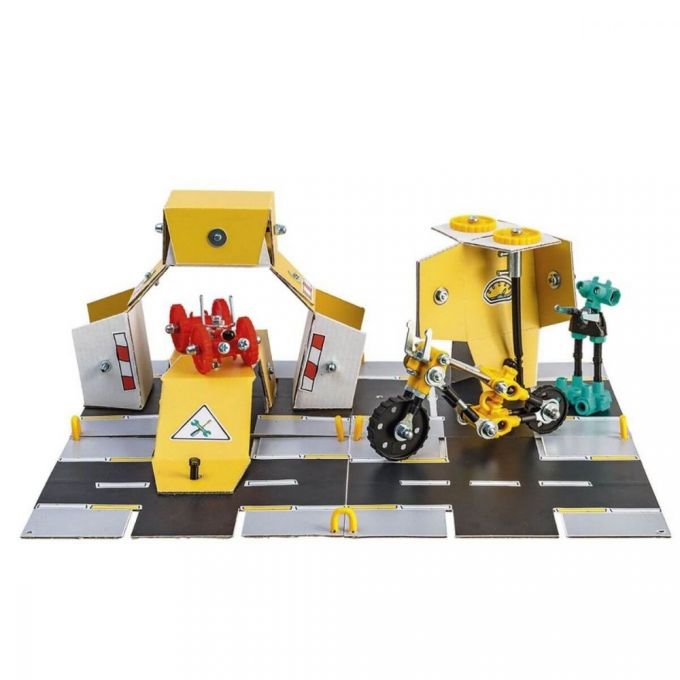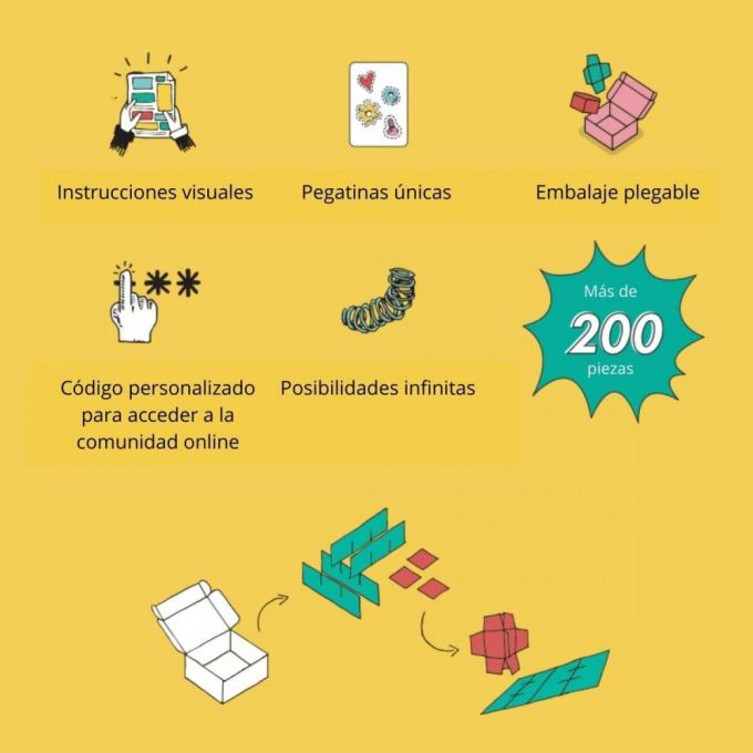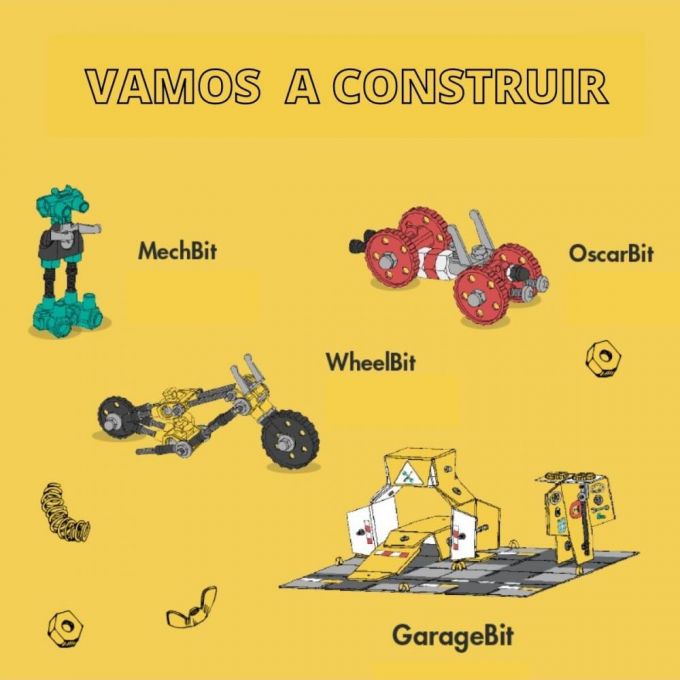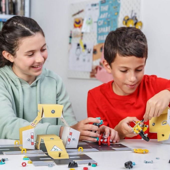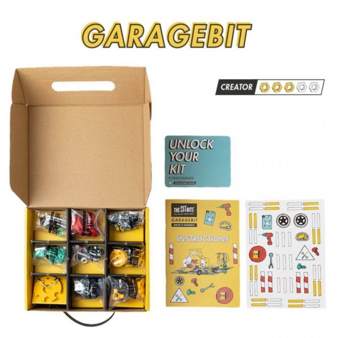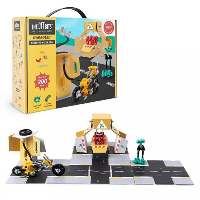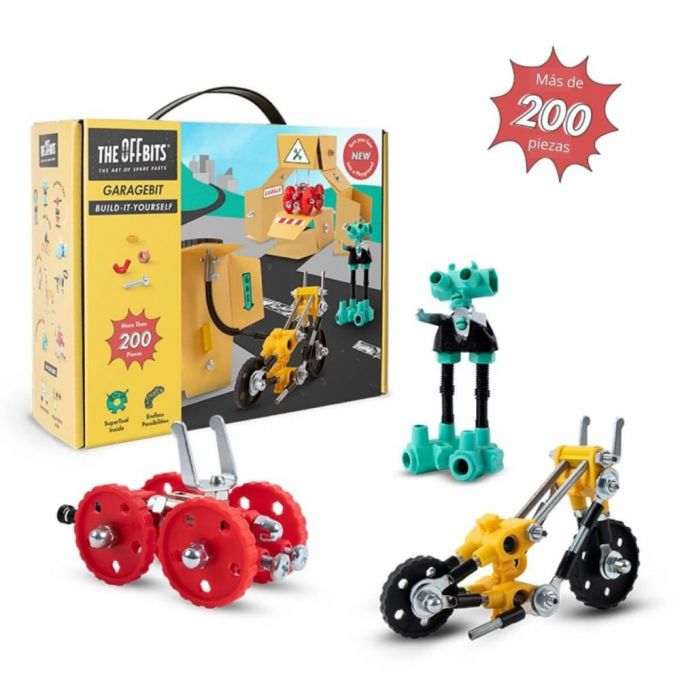 Los Offbits son personajes extravagantes y artilugios de robots creados para ser rediseñados, hechos de trozos y piezas recicladas, impulsados por tu propia creatividad. Ahora puedes usar el packaging de la caja y las pegatinas incluidas para crear un Parking y sus vehículos. Incluye un folleto visual con instrucciones para crear a MechBit (el mecánico), WheelBit (la motocicleta) y OscarBit (el coche de carreras). Con las más de 200 piezas del kit y la Super Herramienta podrás crear muchas construcciones más.