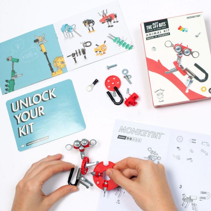 Los Offbits son personajes extravagantes y artilugios de robots creados para ser rediseñados, hechos de trozos y piezas recicladas, impulsados por tu propia creatividad. Cada kit de construcción lleva piezas de distintas formas, colores y tamaños y una Super Herramienta para hacer las construcciones. Sigue las instrucciones visuales y crea tu primer MonkeyBit, a partir de ahí, ¡deja volar tu imaginación y combínalos como quieras!