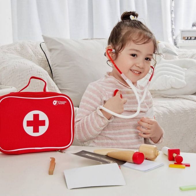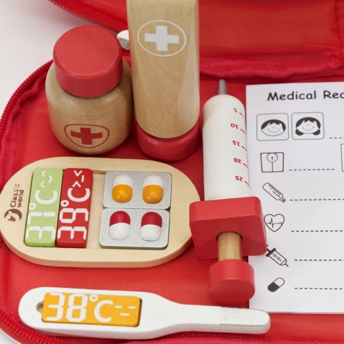 El maletín del doctor es un juguete que permite ponerse en el papel de un/a doctor/a. Incluye distintos elementos de madera como son: 1 inyección, 1 termómetro con distintas temperaturas, unas pinzas, pastillas, 1 pomada, 1 recipiente con alcohol, distintas radiografías, 1 oscultómetro, bloc de notas. Además de un perfecto maletín para transportar todos estos elementos. Ideal para favorecer el juego simbólico y la imitación.