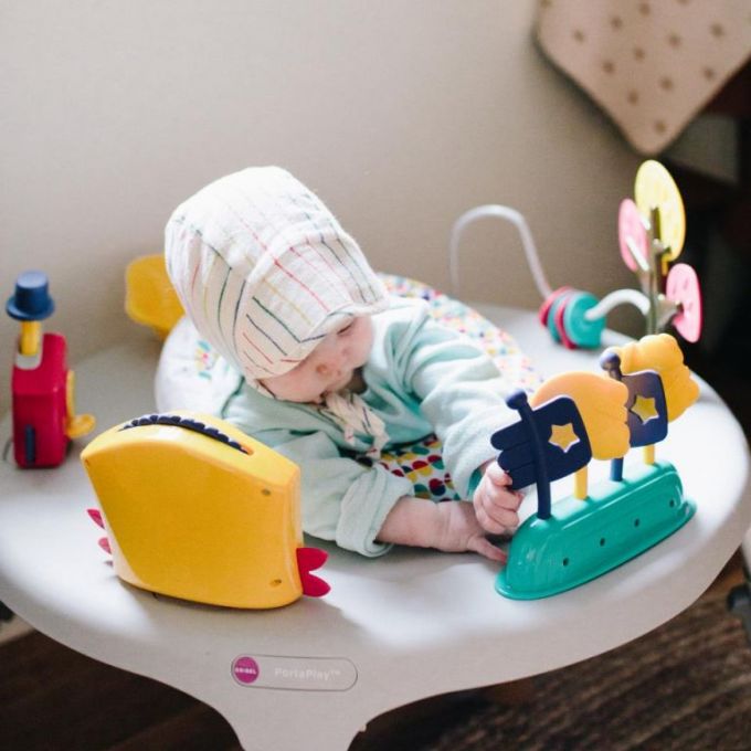 Juguetes de aprendizaje. El centro de actividades PortaPlay cuenta con amplios juguetes para tu pequeño curioso. Los juguetes están cuidadosamente diseñados para entretener y desarrollar habilidades motoras finas y para el desarrollo cognitivo.
