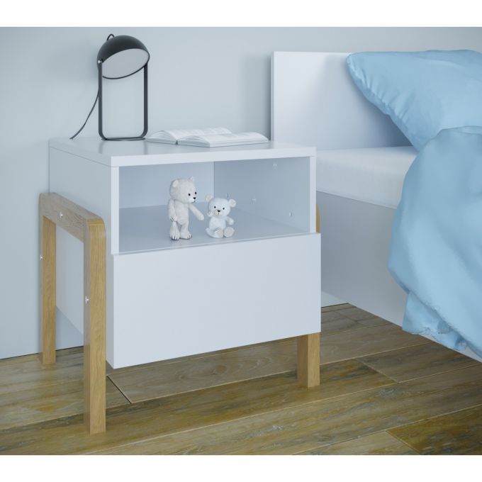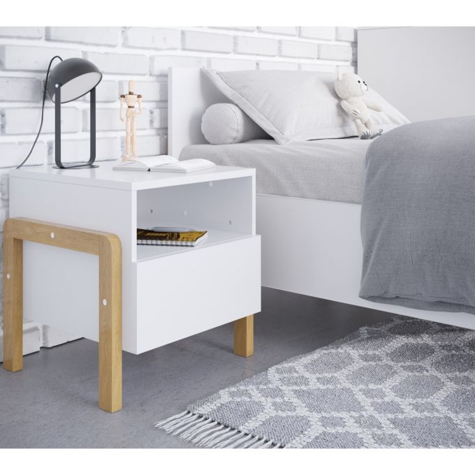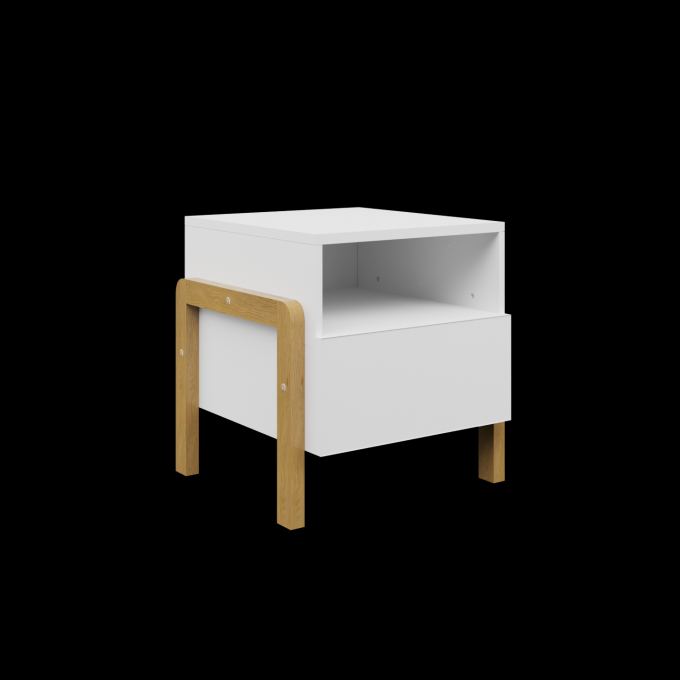 - Una mesita de noche sobre una sólida estructura de madera de roble natural.