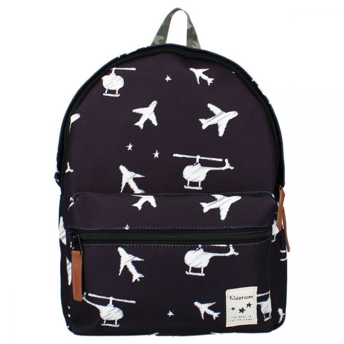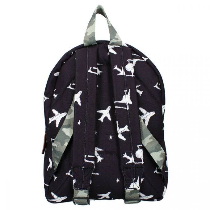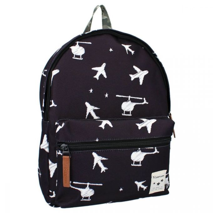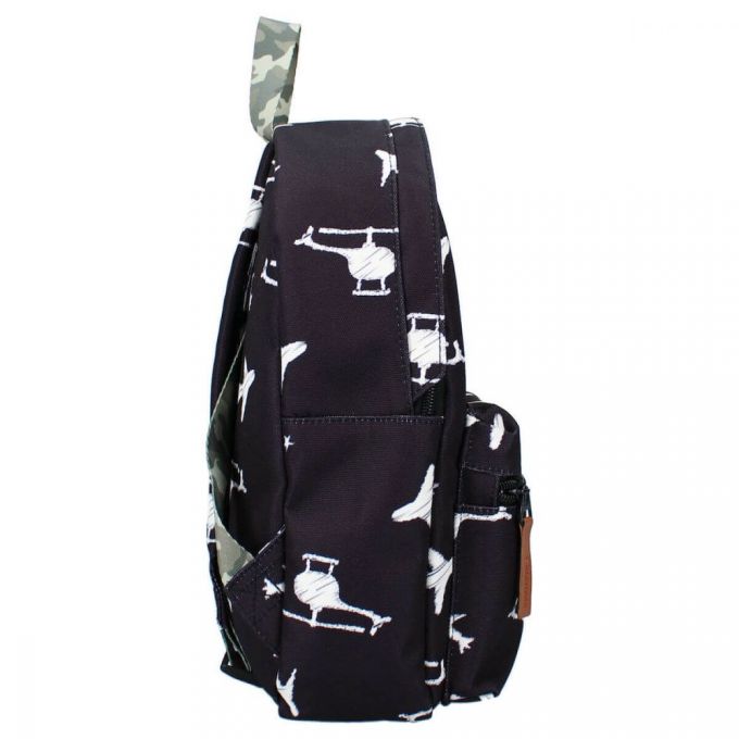 Mochila de color negro con estampado de aviones y helicópteros blancos. Es perfecta para ir al colegio, de excursión o de visita a casa de los abuelos. La mochila tiene un espacioso compartimento principal donde se puede guardar el material escolar, un lunch box y una botella de agua. Dispone de bolsillo exterior, las correas del hombro son ajustables y puedes colgarla fácilmente por el asa superior. Esta mochila está fabricada a partir de botellas de plástico PET recicladas, por lo que se trata de una mochila sostenible que contribuye a reducir la generación de residuos. El material de la mochila proviene de Waste2Wear, que se compromete a reducir los residuos de plástico y se esfuerza por lograr una economía circular. Durante la producción de las materias primas se utiliza un 70% menos de energía, un 75% menos de CO2 y un 86% menos de agua que en la producción de otro tipo de materiales textiles. En esta producción, los residuos plásticos se convierten en telas y productos textiles innovadores que se utilizan para hacer esta mochila.