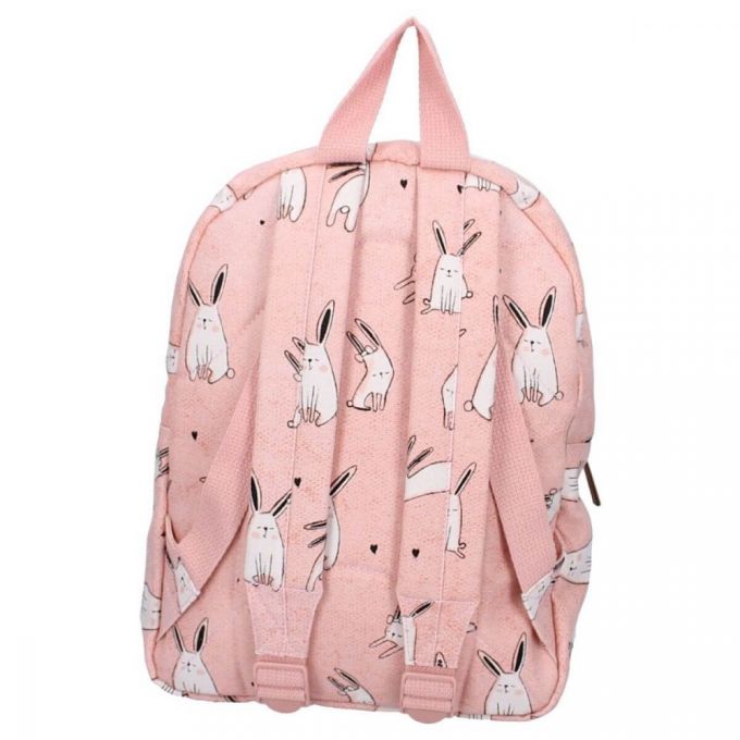 Mochila de color rosa con un dulce estampado de conejos. Es perfecta para que tu peque vaya al colegio, de excursión o de visita a casa de los abuelos. La mochila tiene un espacioso compartimento principal donde se puede guardar el material escolar, un lunch box y una botella de agua. Dispone de bolsillo exterior, las correas del hombro son ajustables y puedes colgarla fácilmente por el asa superior.