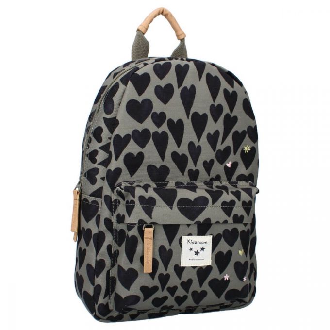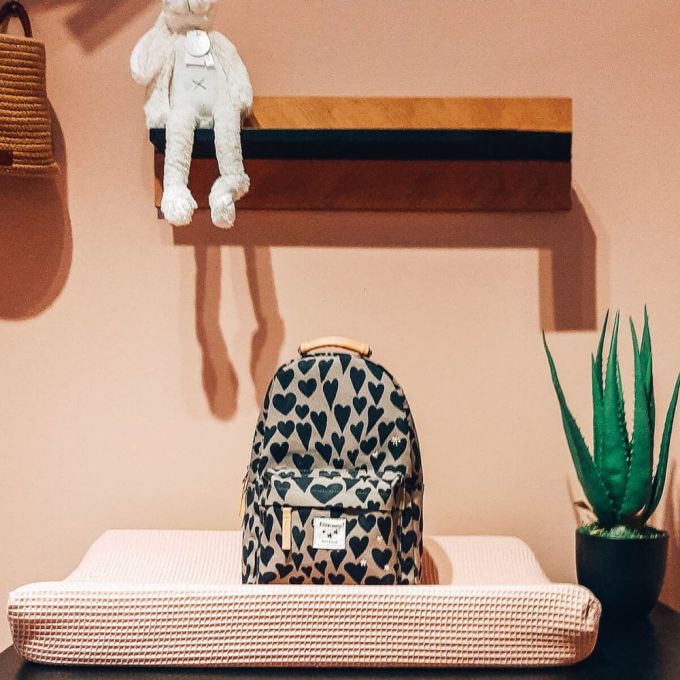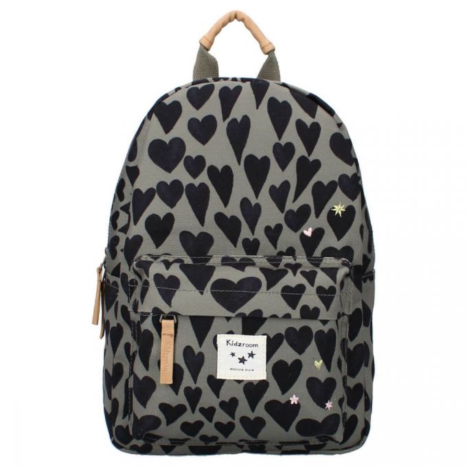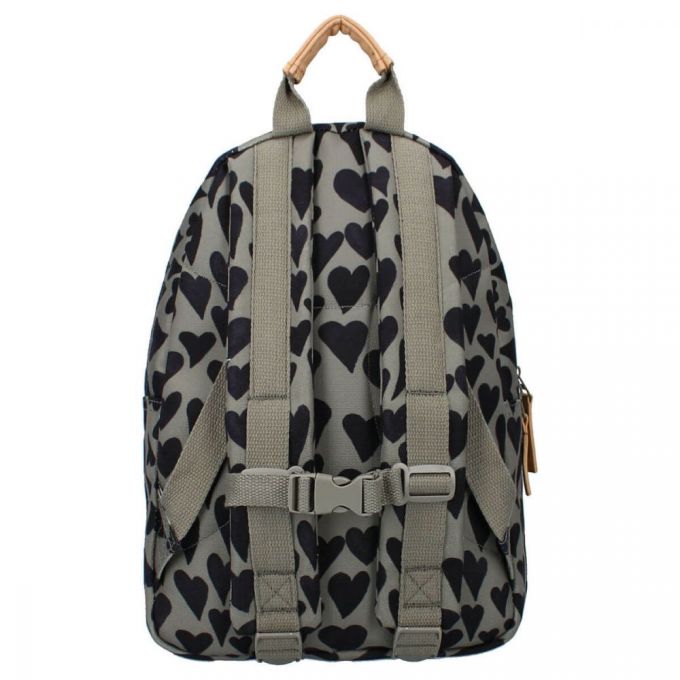 Mochila de color gris con estampado de corazones negros. Es perfecta para ir al colegio, de excursión o de visita a casa de los abuelos. La mochila tiene un espacioso compartimento principal donde se puede guardar el material escolar, un lunch box y una botella de agua. Dispone de bolsillo exterior, las correas del hombro son ajustables y puedes colgarla fácilmente por el asa superior. Esta mochila está fabricada a partir de botellas de plástico PET recicladas, por lo que se trata de una mochila sostenible que contribuye a reducir la generación de residuos. El material de la mochila proviene de Waste2Wear, que se compromete a reducir los residuos de plástico y se esfuerza por lograr una economía circular. Durante la producción de las materias primas se utiliza un 70% menos de energía, un 75% menos de CO2 y un 86% menos de agua que en la producción de otro tipo de materiales textiles. En esta producción, los residuos plásticos se convierten en telas y productos textiles innovadores que se utilizan para hacer esta mochila.