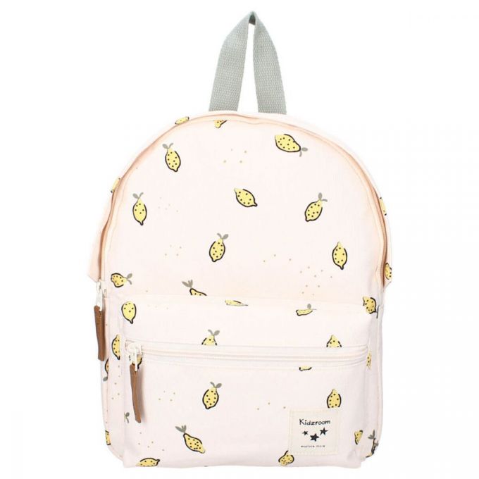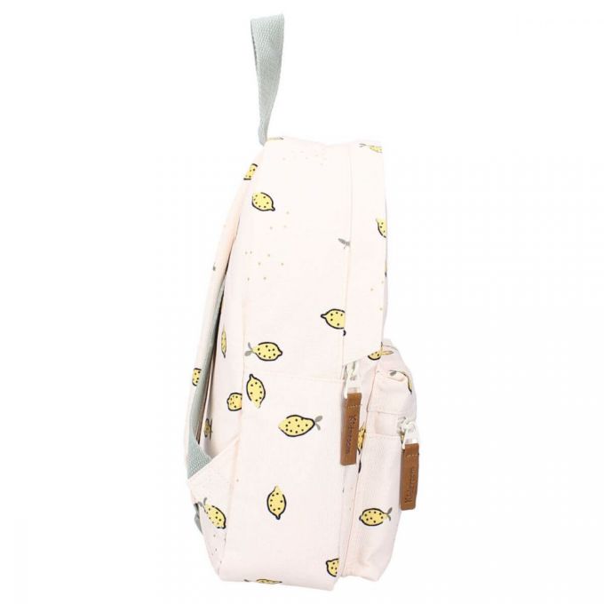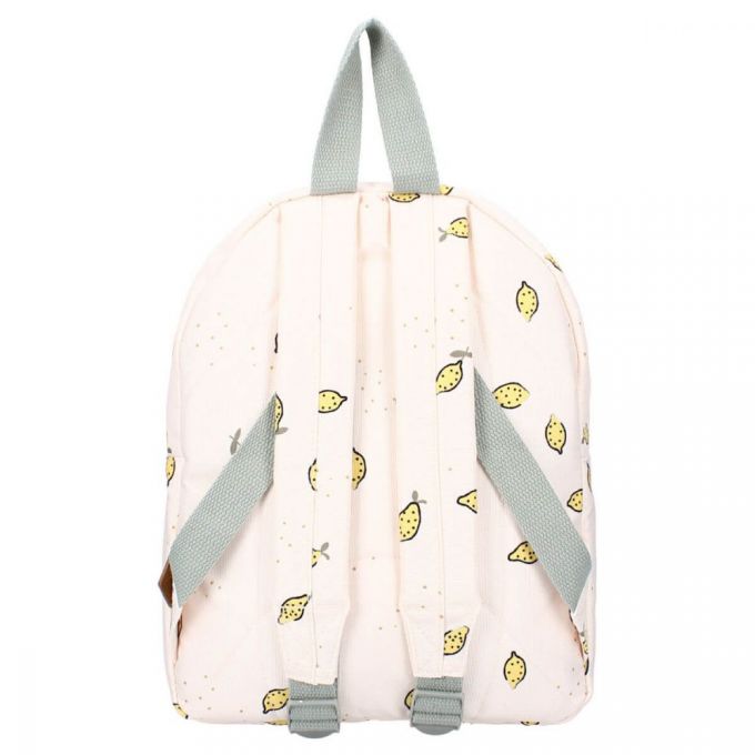 Mochila de color amarillo pálido con estampado de limones. Es perfecta para ir al colegio, de excursión o de visita a casa de los abuelos. La mochila tiene un espacioso compartimento principal donde se puede guardar el material escolar, un lunch box y una botella de agua. Dispone de bolsillo exterior, las correas del hombro son ajustables y puedes colgarla fácilmente por el asa superior. Esta mochila está fabricada a partir de botellas de plástico PET recicladas, por lo que se trata de una mochila sostenible que contribuye a reducir la generación de residuos. El material de la mochila proviene de Waste2Wear, que se compromete a reducir los residuos de plástico y se esfuerza por lograr una economía circular. Durante la producción de las materias primas se utiliza un 70% menos de energía, un 75% menos de CO2 y un 86% menos de agua que en la producción de otro tipo de materiales textiles. En esta producción, los residuos plásticos se convierten en telas y productos textiles innovadores que se utilizan para hacer esta mochila.