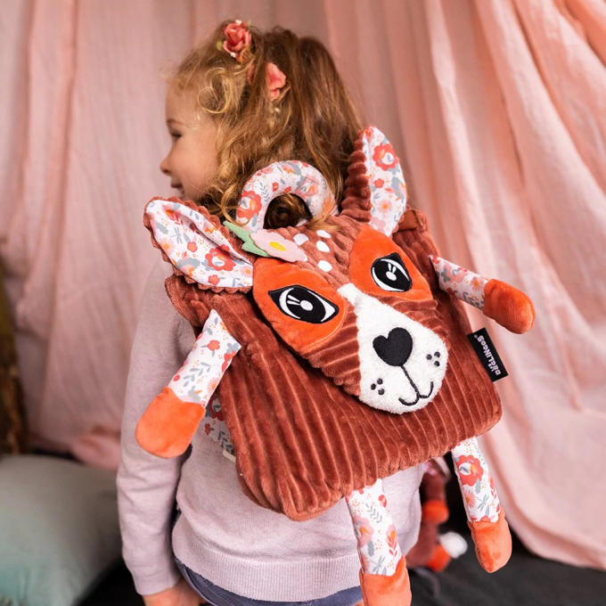 ¡Con sus anchas correas ajustables y su bonita asa acolchada, la mochila de terciopelo Melimélos la biche es fácil y práctica de llevar! Gracias a su cierre de cremallera, ¡no hay riesgo de perder el peluche o la merienda! ¡Esta pequeña mochila es muy resistente y se lava fácilmente para seguir a tus peques en sus aventuras más locas!