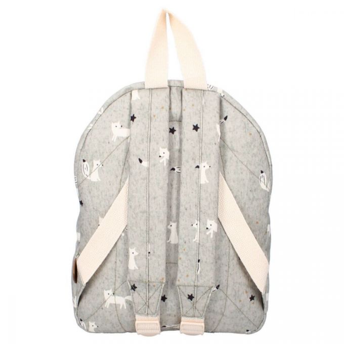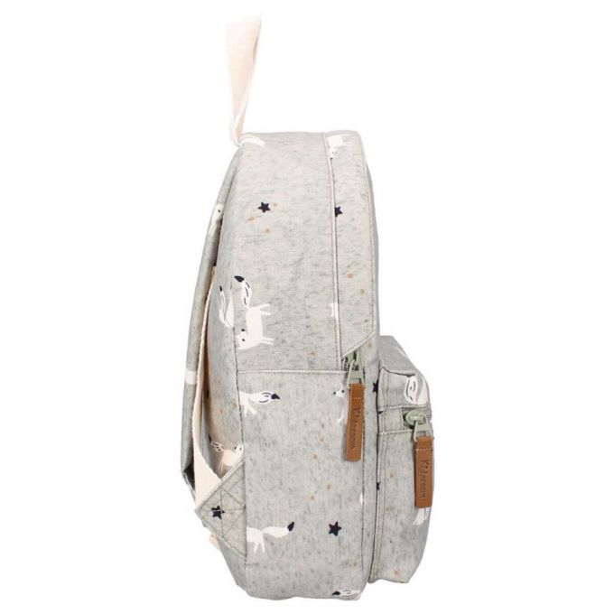 Mochila de color gris con estampado de zorros. Es perfecta para ir al colegio, de excursión o de visita a casa de los abuelos. La mochila tiene un espacioso compartimento principal donde se puede guardar el material escolar, un lunch box y una botella de agua. Dispone de bolsillo exterior, las correas del hombro son ajustables y puedes colgarla fácilmente por el asa superior. Esta mochila está fabricada a partir de botellas de plástico PET recicladas, por lo que se trata de una mochila sostenible que contribuye a reducir la generación de residuos. El material de la mochila proviene de Waste2Wear, que se compromete a reducir los residuos de plástico y se esfuerza por lograr una economía circular. Durante la producción de las materias primas se utiliza un 70% menos de energía, un 75% menos de CO2 y un 86% menos de agua que en la producción de otro tipo de materiales textiles. En esta producción, los residuos plásticos se convierten en telas y productos textiles innovadores que se utilizan para hacer esta mochila.