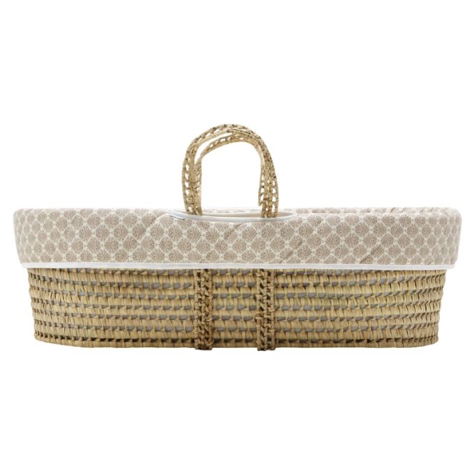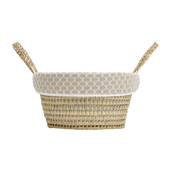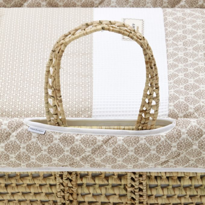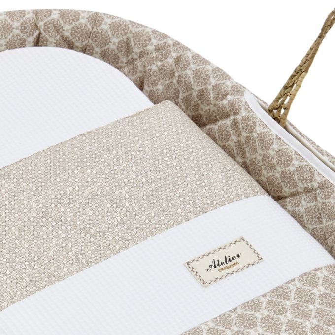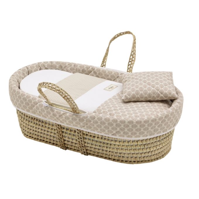 El moisés de palma acolchado de Cambrass, está indicado para los primeros meses de vida del bebé y gracias a sus asas su transporte es muy sencillo. Consta de una base de mimbre, colchón, colcha, cojín y vestidura, que puede coordinarse con la decoración de la habitación. Además, cuenta con todos los certificados que garantizan la seguridad del bebé velando por su salud ya que el mimbre del moisés está tratado para la eliminación de pequeñas larvas de psocópteros que en determinadas ocasiones se encuentran en las hojas de palma utilizadas en la fabricación de los moisés. Según normativa, este producto soporta bebés con un peso de hasta 9 kg.
