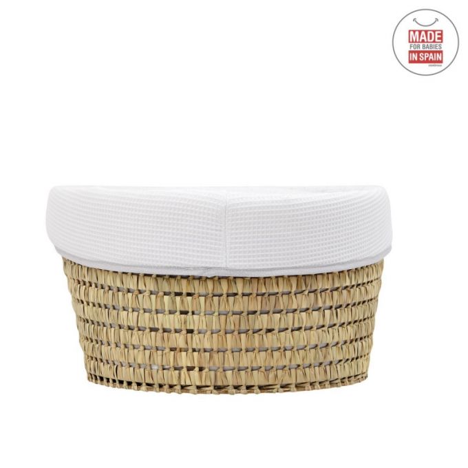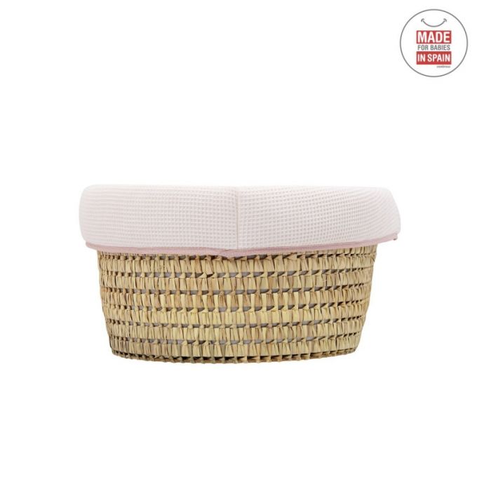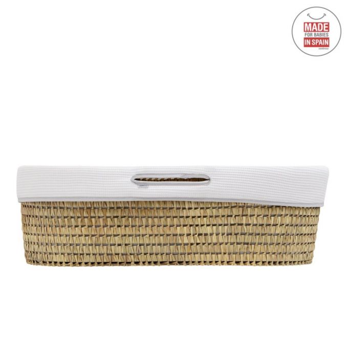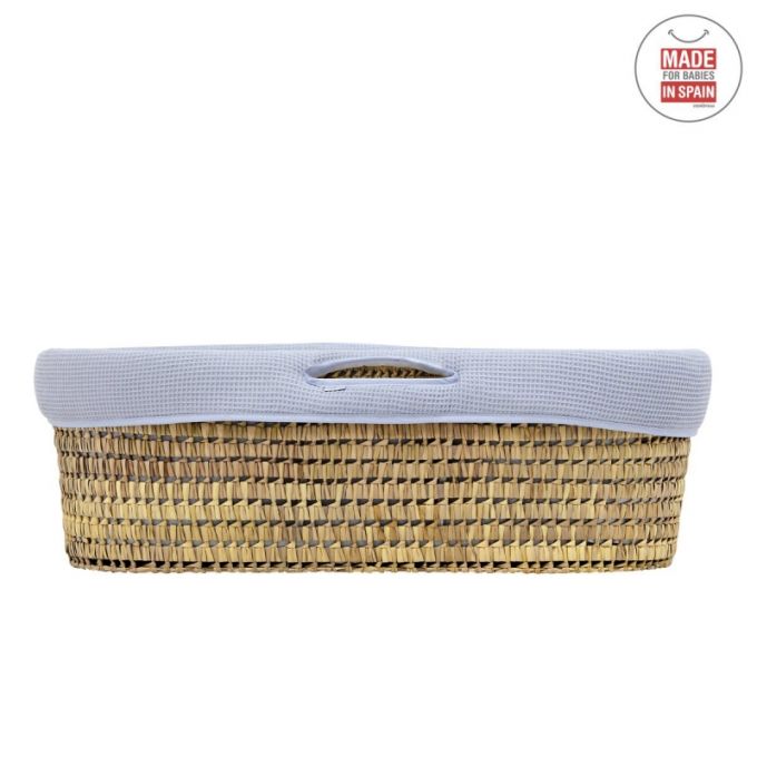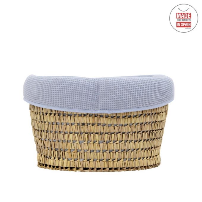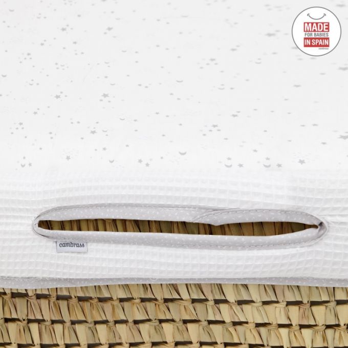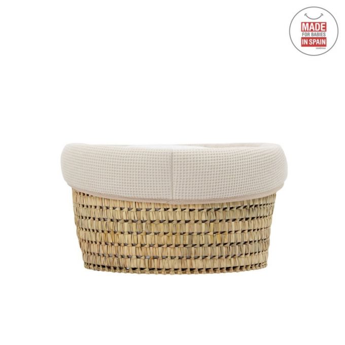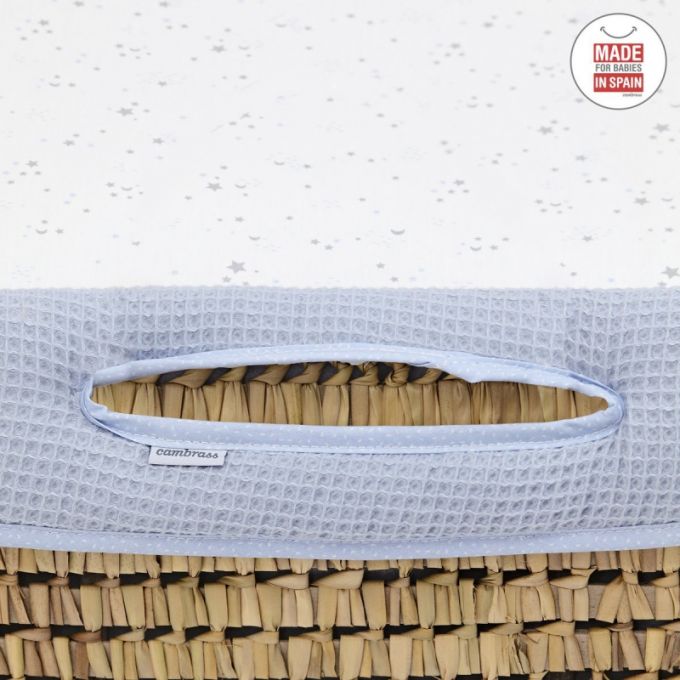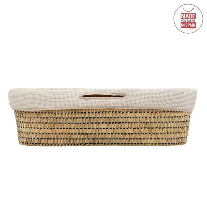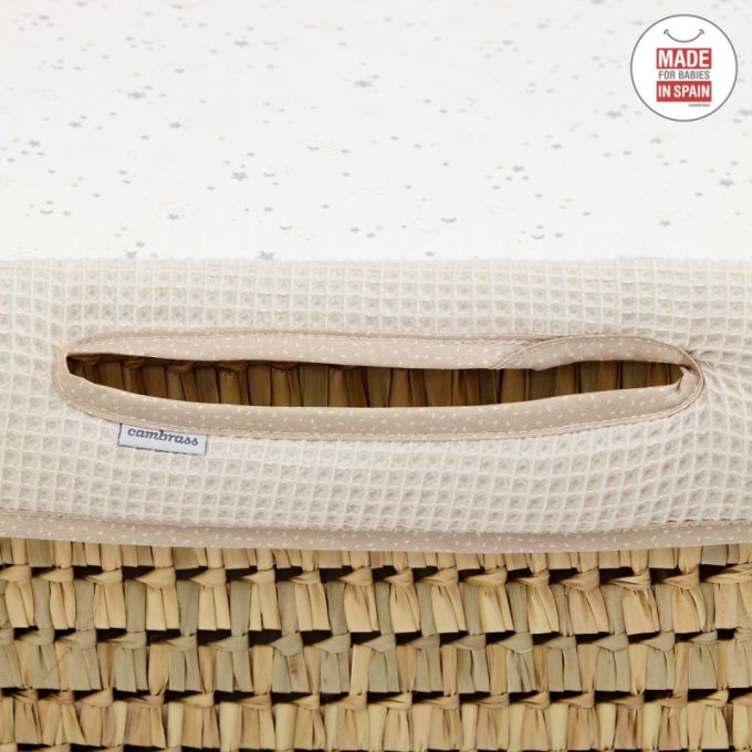 El Capazo de palma acolchado de Cambrass, está indicado para los primeros meses de vida del bebé y gracias a sus asas su trasporte es muy sencillo. Consta de una base de mimbre, somier de madera de 5 mm, colchón, colcha, cojín y vestidura, que puede coordinarse con la decoración de la habitación.