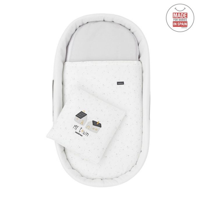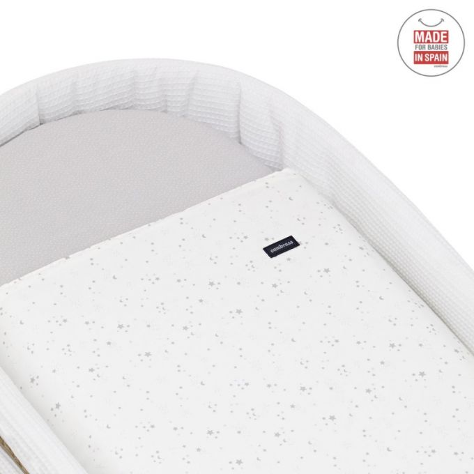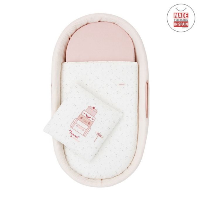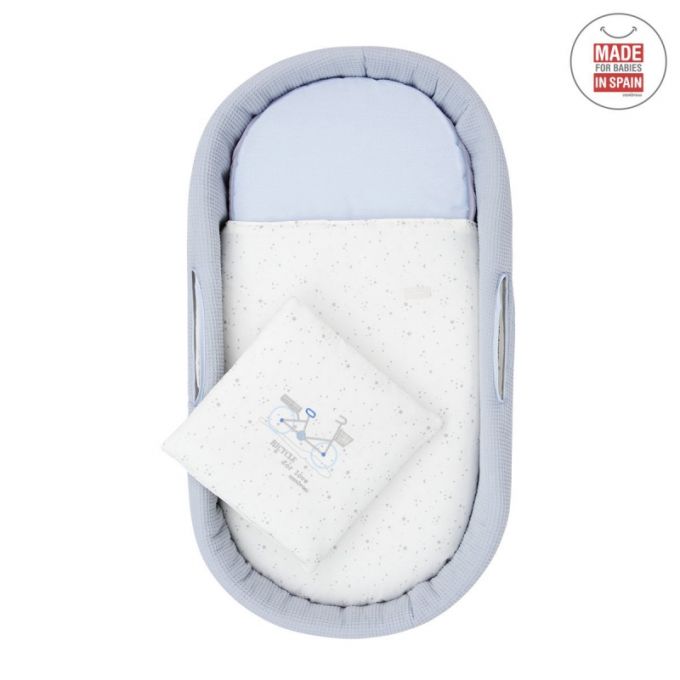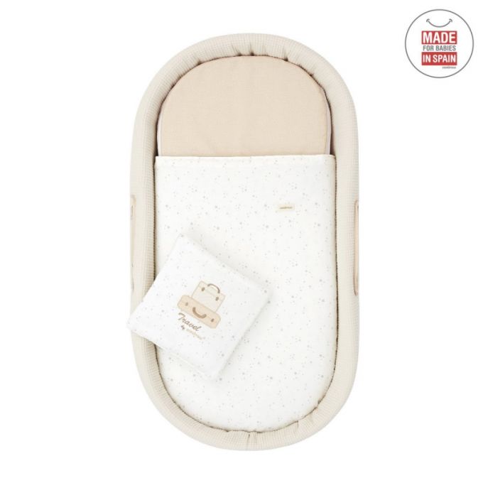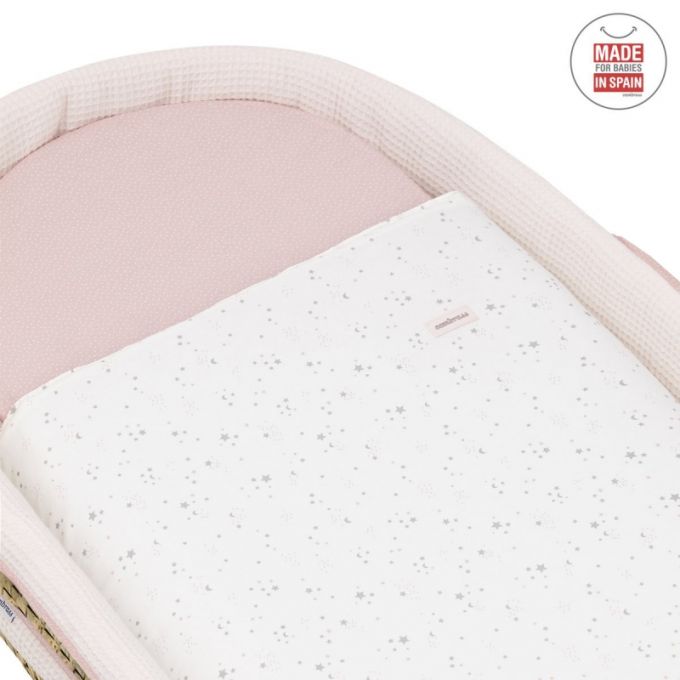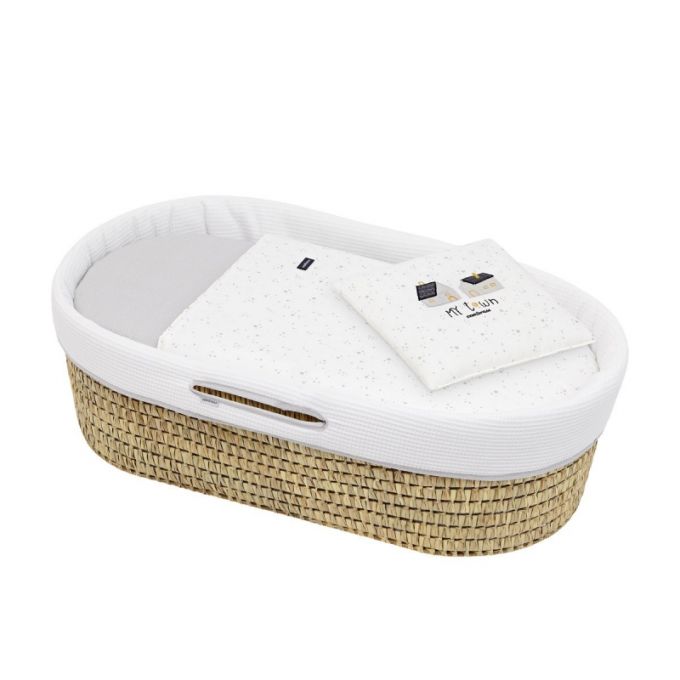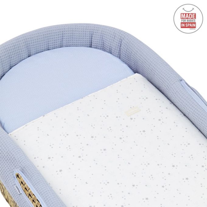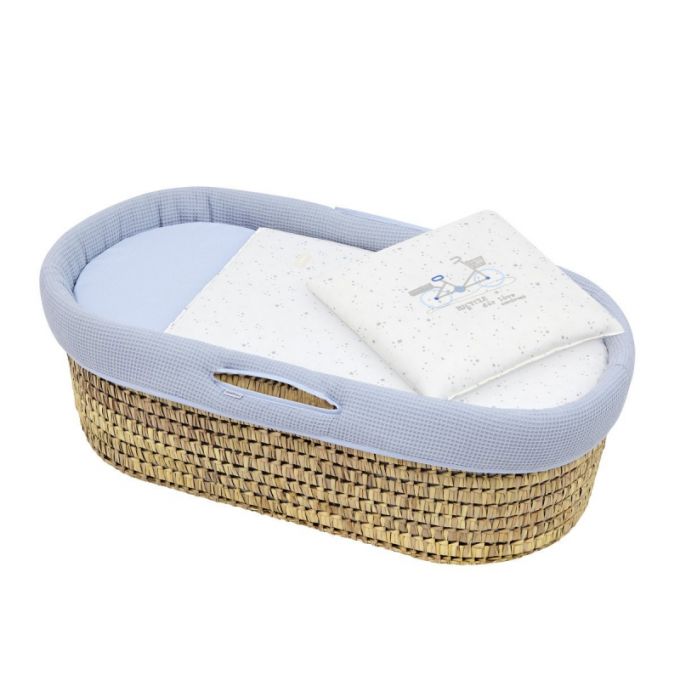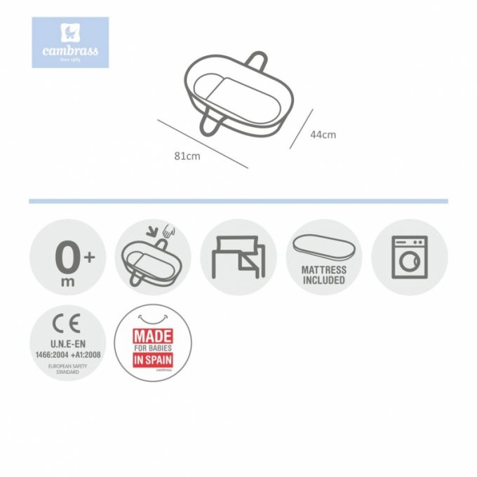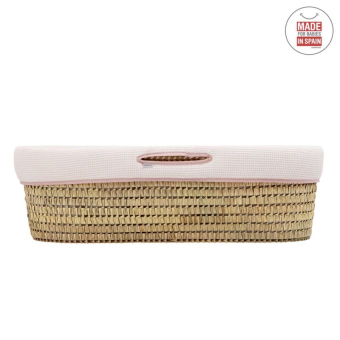 El Capazo de palma acolchado de Cambrass, está indicado para los primeros meses de vida del bebé y gracias a sus asas su trasporte es muy sencillo. Consta de una base de mimbre, somier de madera de 5 mm, colchón, colcha, cojín y vestidura, que puede coordinarse con la decoración de la habitación.