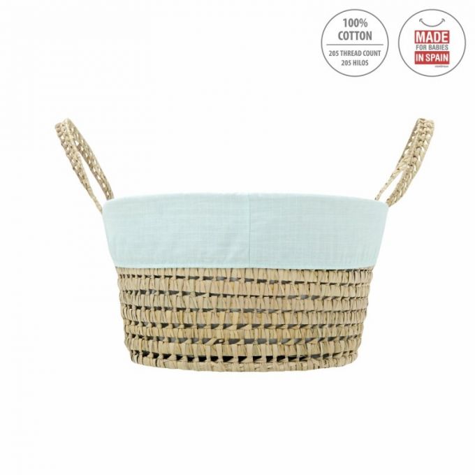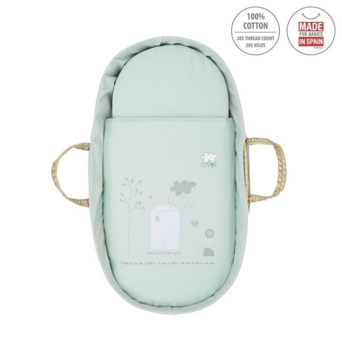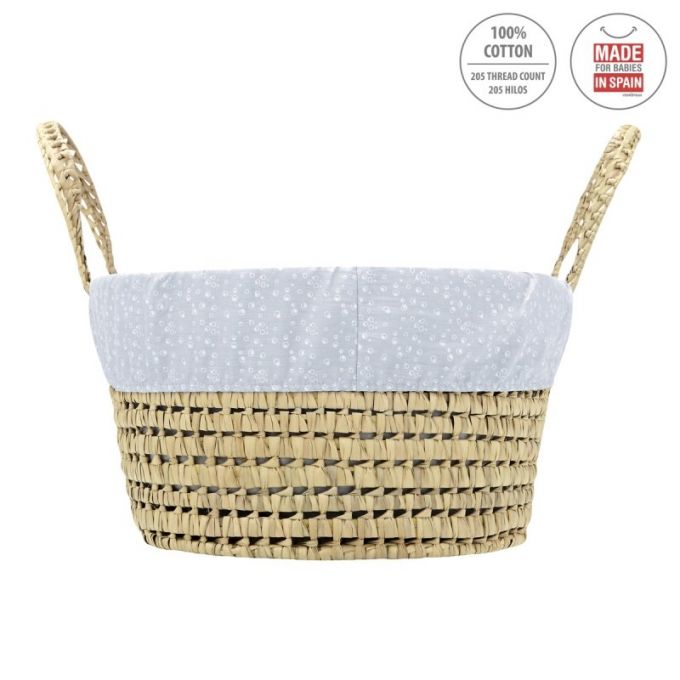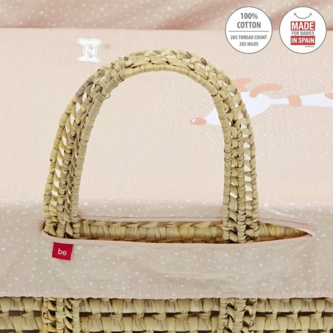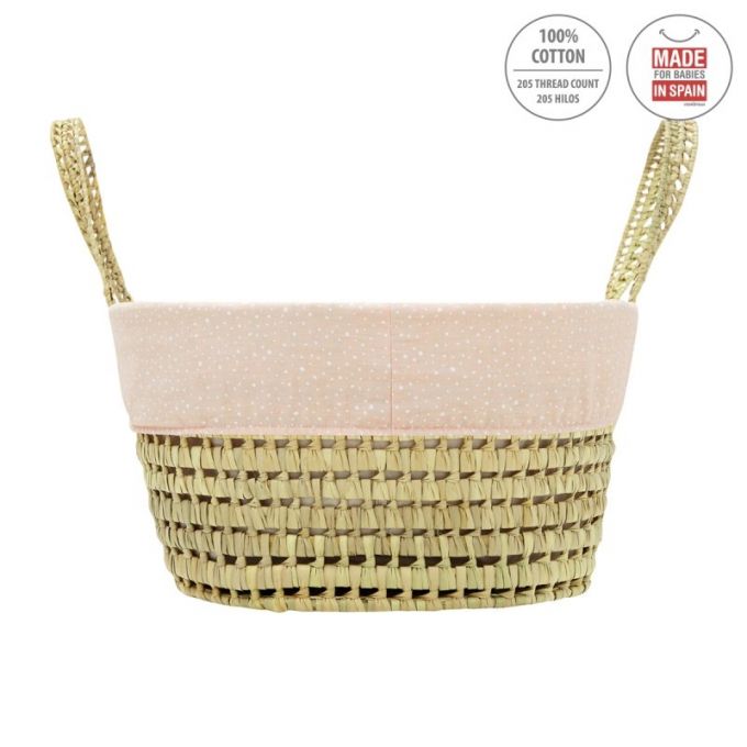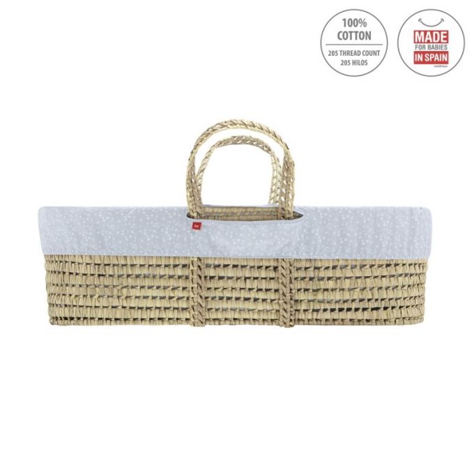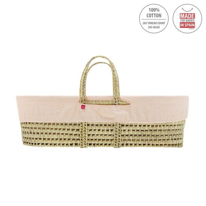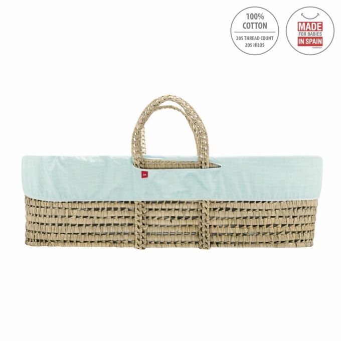 El moisés de palma, está indicado para los primeros meses de vida del bebé y gracias a sus asas su transporte es muy sencillo. Consta de una base de mimbre, colchón, colcha, cojín y vestidura, que puede coordinarse con la decoración de la habitación. Además, cuenta con todos los certificados que garantizan la seguridad del bebé velando por su salud ya que el mimbre del moisés está tratado para la eliminación de pequeñas larvas de psocópteros que en determinadas ocasiones se encuentran en las hojas de palma utilizadas en la fabricación de los moisés.