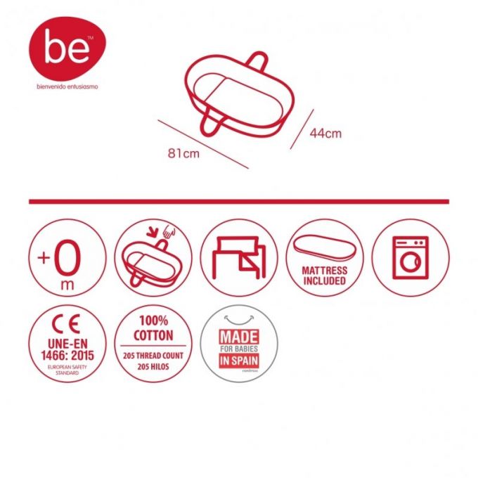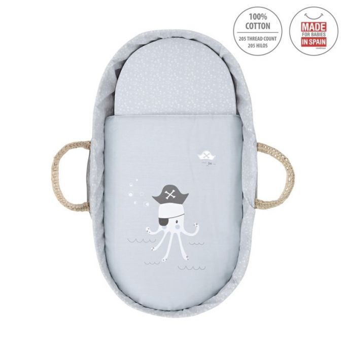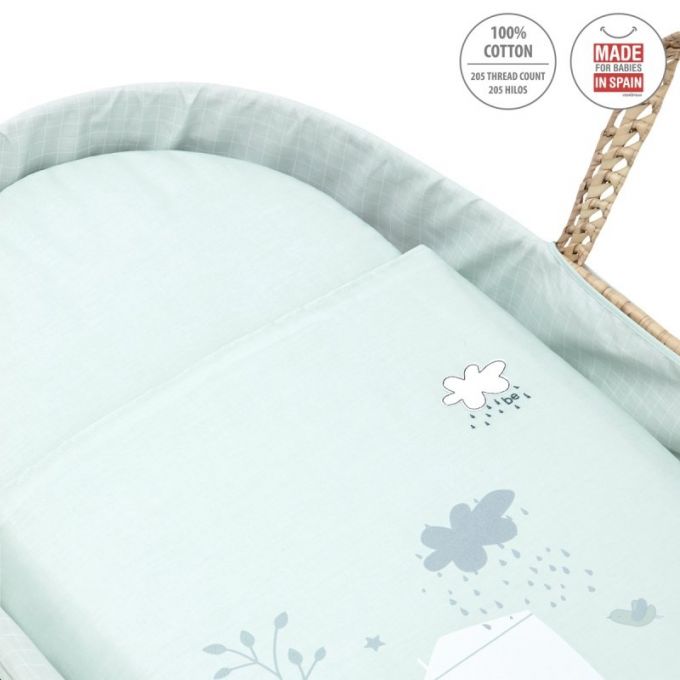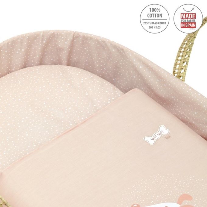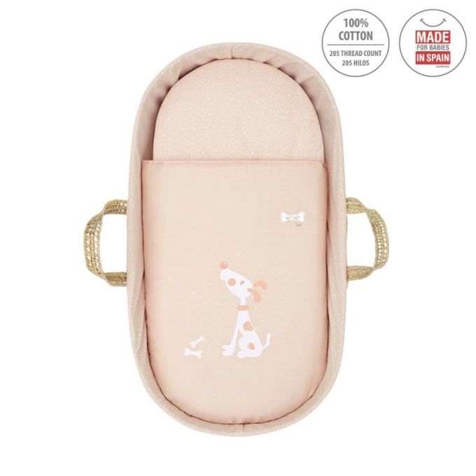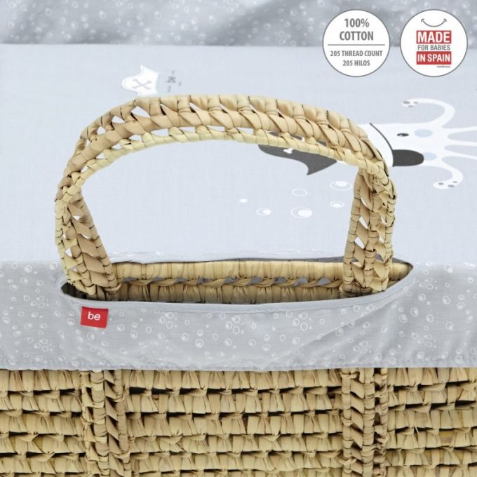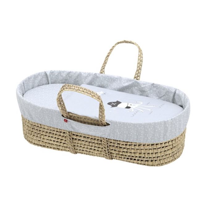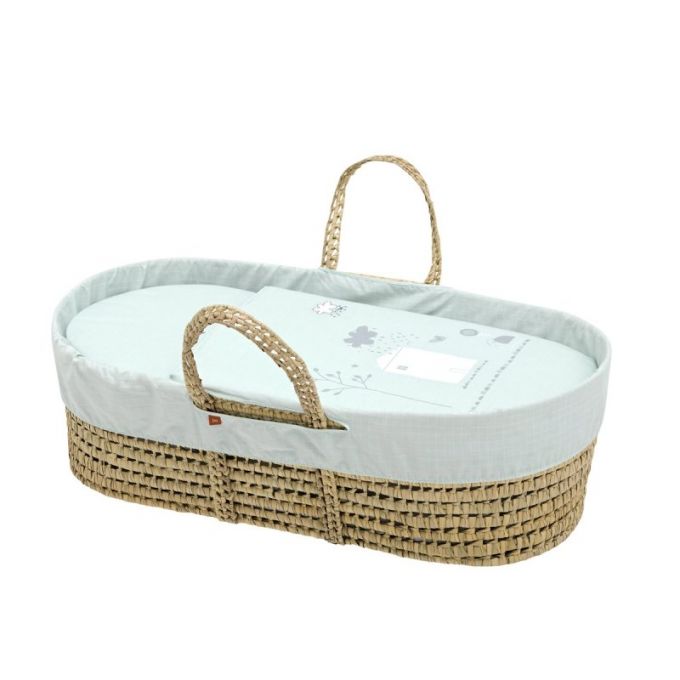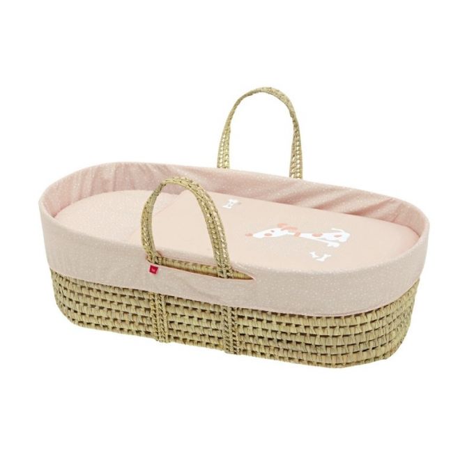 El moisés de palma, está indicado para los primeros meses de vida del bebé y gracias a sus asas su transporte es muy sencillo. Consta de una base de mimbre, colchón, colcha, cojín y vestidura, que puede coordinarse con la decoración de la habitación. Además, cuenta con todos los certificados que garantizan la seguridad del bebé velando por su salud ya que el mimbre del moisés está tratado para la eliminación de pequeñas larvas de psocópteros que en determinadas ocasiones se encuentran en las hojas de palma utilizadas en la fabricación de los moisés.