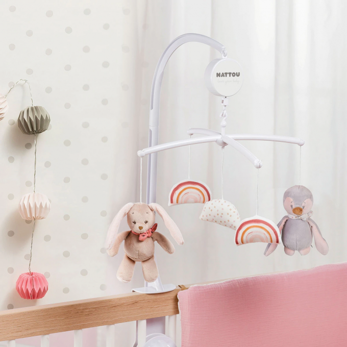 Móvil con Caja de música Conejo y Pingüino rosa/gris/marrón. Suave canción de cuna 'La-Le-Lu', Pauline y Sasha.