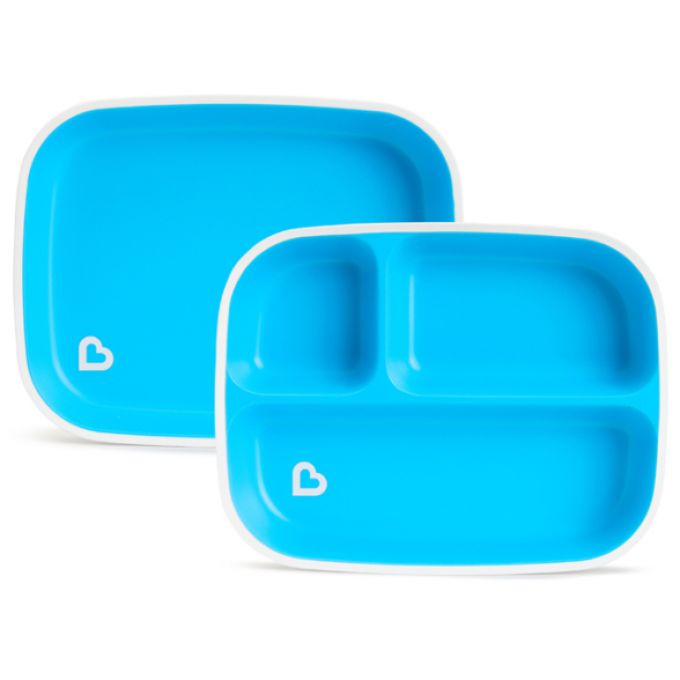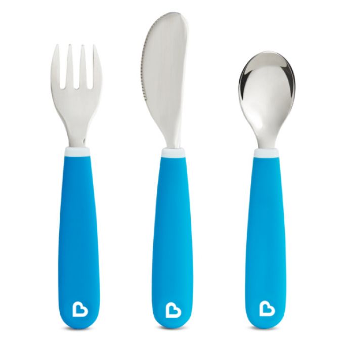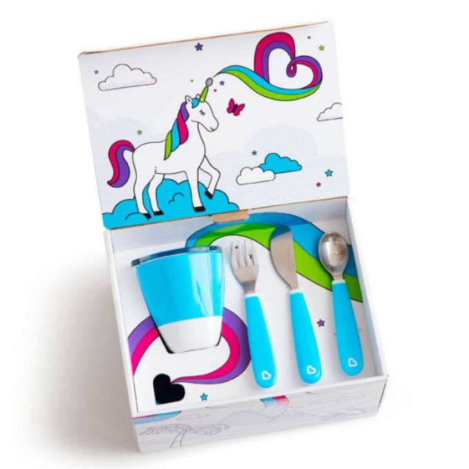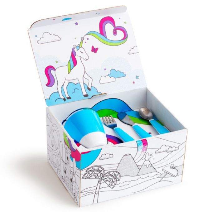 Incluye plato dividido, plato llano, cuenco, vaso con tapa de entrenamiento, y cubiertos (tenedor, cuchara y cuchillo).