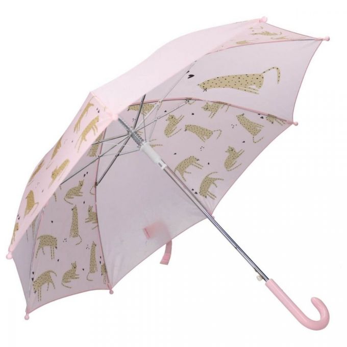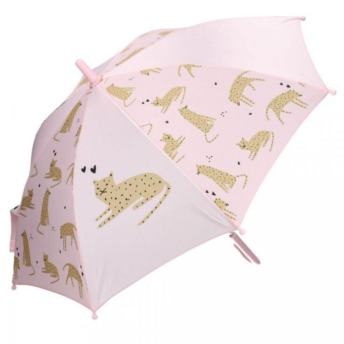 Paraguas infantil automático con 8 varillas de metal para refugiarse de la lluvia e ir a la última moda. De color rosa y un divertido estampado de panteras.