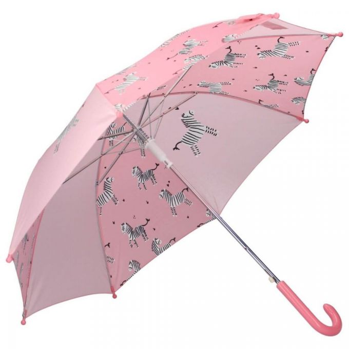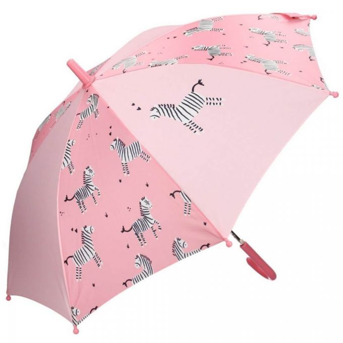 Paraguas infantil automático con 8 varillas de metal para refugiarse de la lluvia e ir a la última moda. De color rosa y un divertido estampado de zebras.