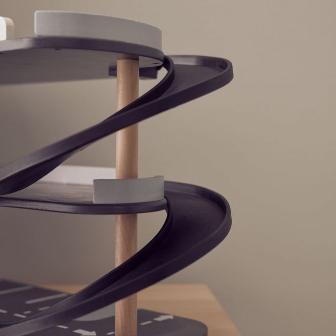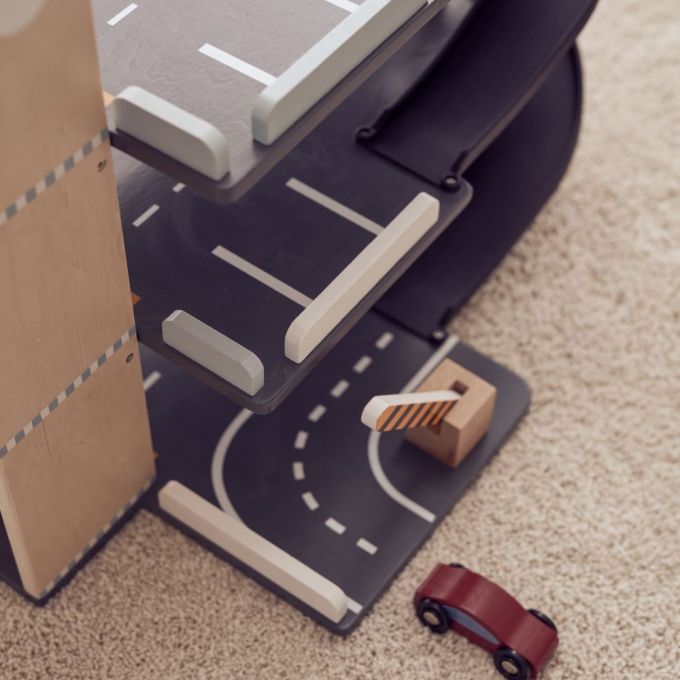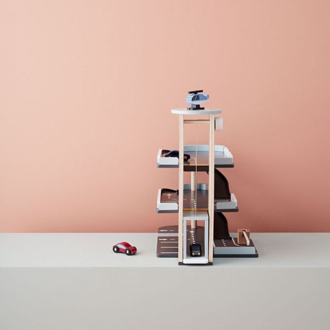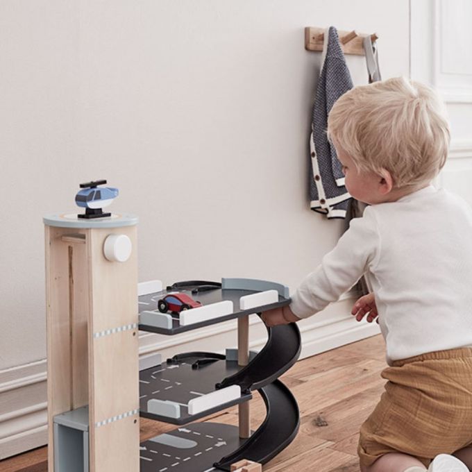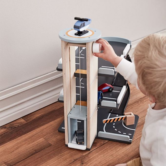 Juego de garaje de madera, con tres niveles. Tiene todo lo que su pequeño necesita para crear emocionantes aventuras, acelerar y bajar las rampas o llevar el elevador de cuerda a todos los niveles, asegurarse de detenerse en la barrera de peaje, o abrocharse el cinturón de seguridad y tomar el helicóptero con su propio helipuerto.