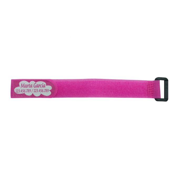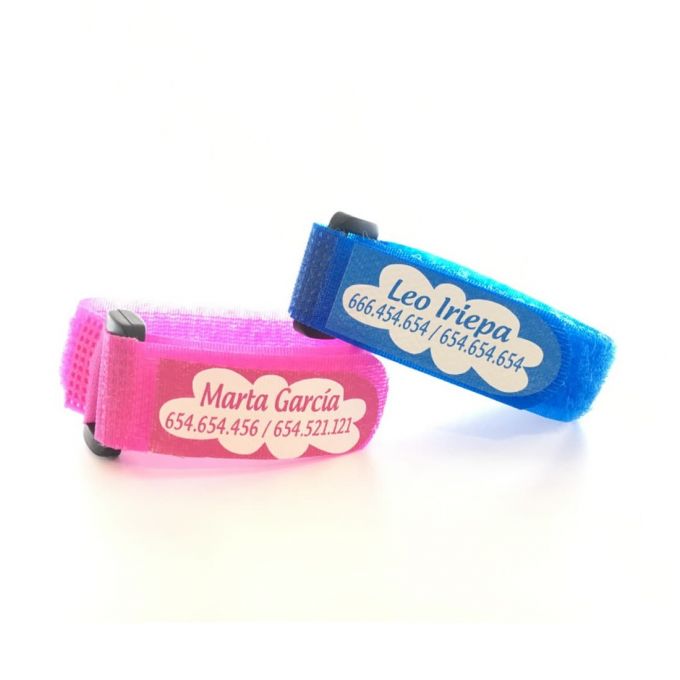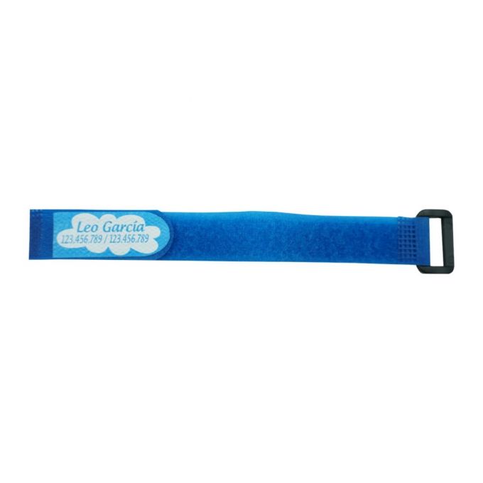 Pulsera identificativa infantil de seguridad con el nombre y espacio para escribir un teléfono de contacto por ejemplo, aunque se puede poner cualquier frase. Tiene un cierre de velcro y es resistente al agua, ideal para estar identificado en piscinas o playas.
