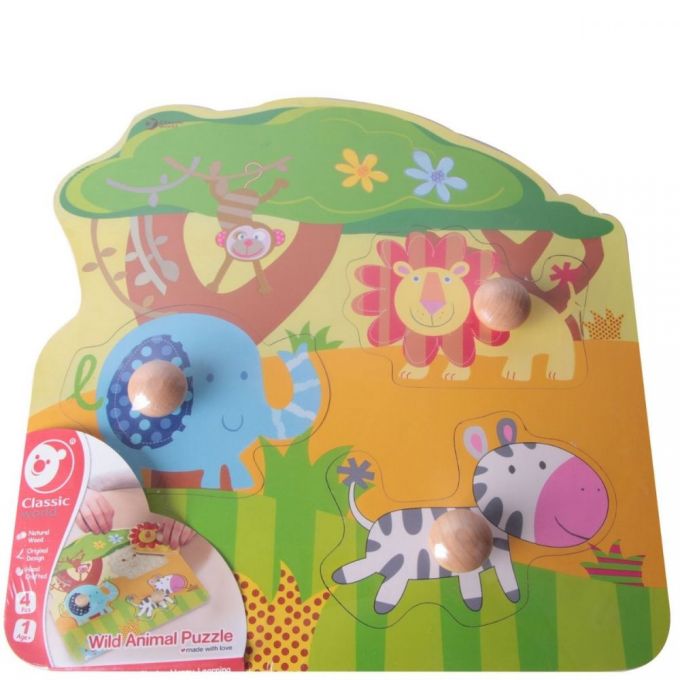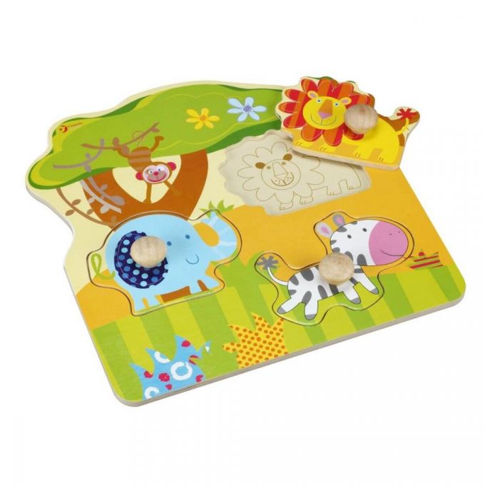 Puzzle animales de la selva es un rompecabezas con imágenes de animales de la selva brillantes y coloridas de un tamaño perfecto para manos pequeñas. Tu peque aprenderá a representar roles e identificar los animales y colores de la selva mientras hace coincidir las piezas del rompecabezas con el espacio correcto en el tablero.
