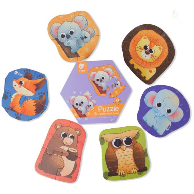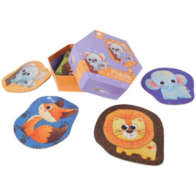 Incluye 6 puzzles de cartón de 4 piezas cada uno de distintos animales salvajes: koala, león, elefante, búho, oso y zorro. Las piezas son grandes para que pueda montarlo un niño/a a partir de 18 meses.