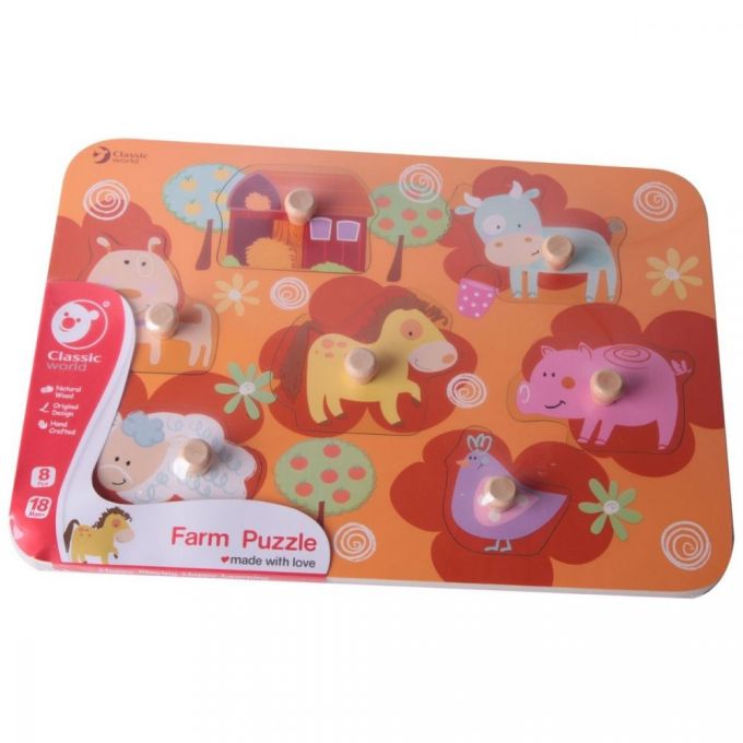 Puzzle granja es un puzzle temático de "Granja" de 8 piezas las cuales tienen una clavija del tamaño de un dedo para un fácil manejo. Tu hij@ aprenderá a nombrar e identificar las distintas piezas y hacerlas coincidir con las imágenes de la pizarra. Fomenta la resolución de problemas y el descubrimiento.