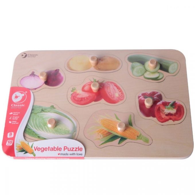 Este puzzle verduras de madera extragrueso incluye 8 piezas coloridas con forma de vegetales, cada una con un agarre de madera gigante que es fácil de agarrar para l@s pequeñ@s. Debajo de cada pieza aparecen imágenes a todo color para que l@s niñ@s desarrollen la coordinación ojo-mano, la motricidad fina, la percepción visual y sus primeras palabras.