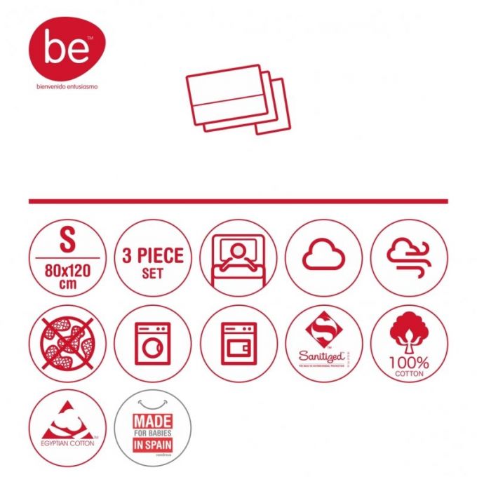 La sábana moisés 3 piezas de Be es de algodón egipcio 100% lo que le aporta un tacto suave y sirve para moisés. El set está compuesto de sábana encimera, sábana bajera y funda para almohada.
