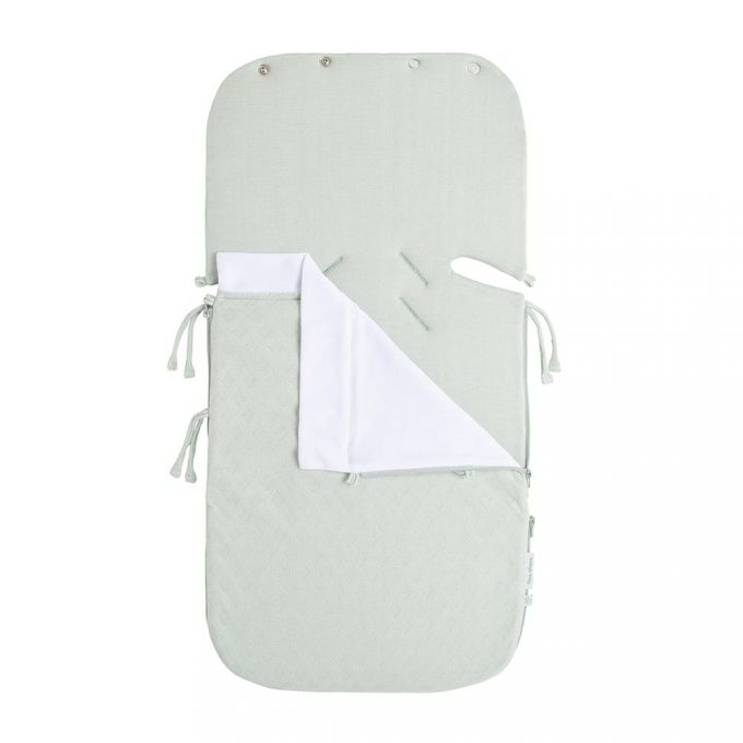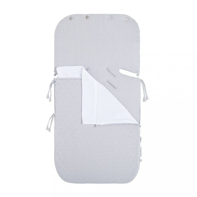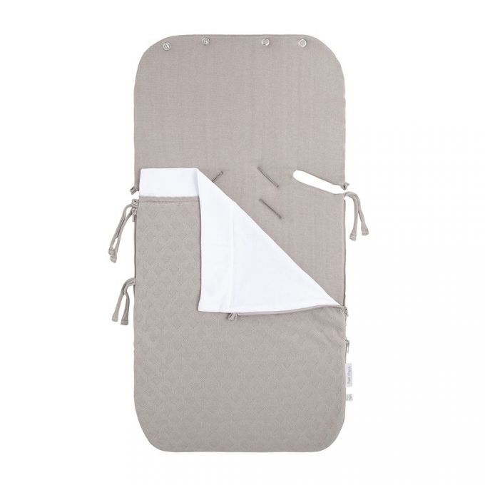 El material ecológico es flexible, lavable, no destiñe y conserva su forma. El exclusivo patrón de tejido en forma de diamante y el hermoso color grisáceo le dan a este saco un toque moderno y chic. El cubrepiés se puede utilizar en todas las sillas de coche 0+ y está disponible en varios colores de moda.