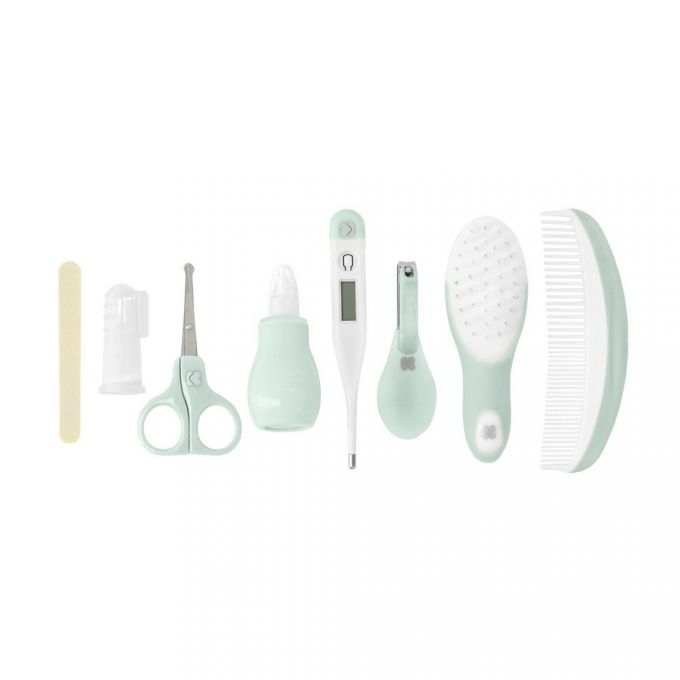 El juego incluye: termómetro digital, aspirador nasal, peine, cepillo de pelo, masajeador de encías, cortaúñas, tijeras y limas de uñas.