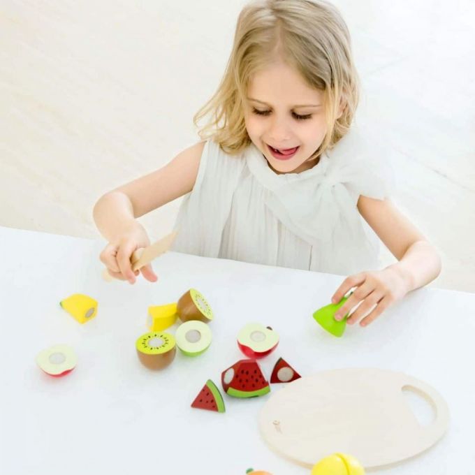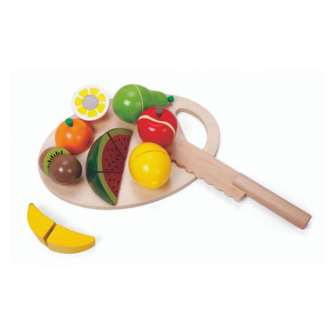 El set de cortar frutas incluye: 7 frutas, 1 cuchillo de corte y 1 tabla de cortar. Ayuda a l@s niñ@s a reconocer diferentes frutas y practicar sus habilidades motoras a la hora de cortar las frutas de madera las cuales se unen mediante un velcro.