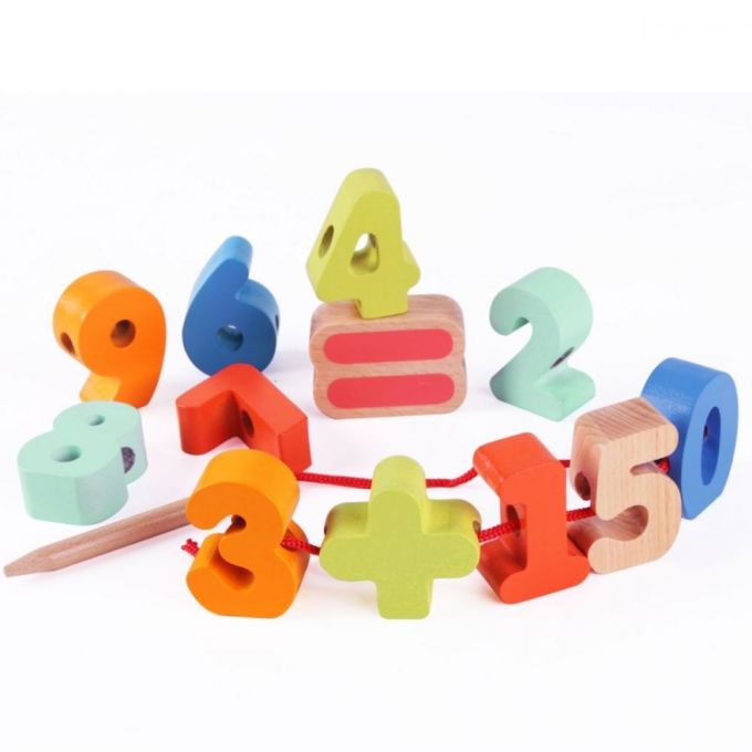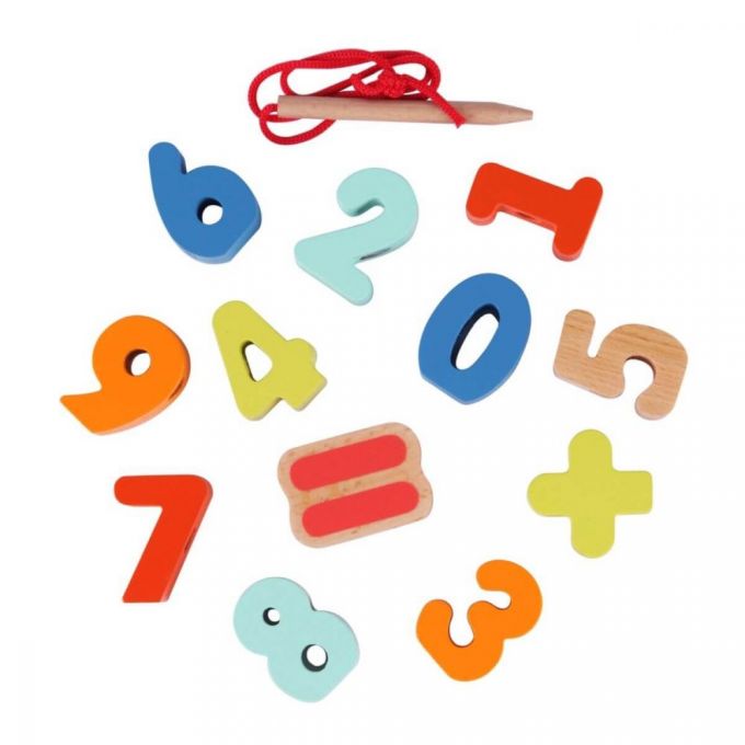 El set de ensartar números es un juguete de cordones que incluye 12 piezas con números coloridos. L@s niñ@s pueden aprender los distintos números y contarlos, mientras practican sus habilidades motoras finas al unirlos.