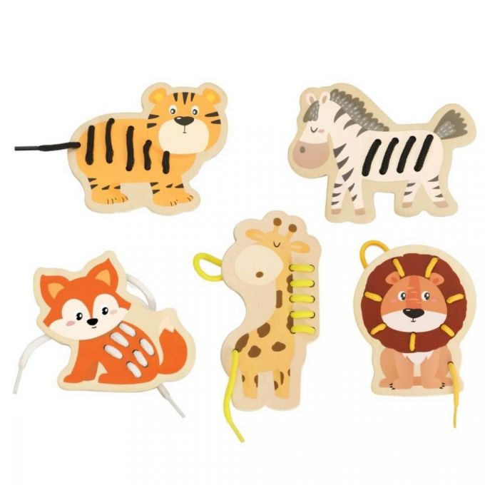 Grandes piezas de madera con forma de animales de África para enlazar según distintos patrones. Ideal para desarrollar la coordinación ojo - mano, la motricidad fina y para aprender la técnica necesaria para posteriormente saber atarse los cordones de los zapatos.