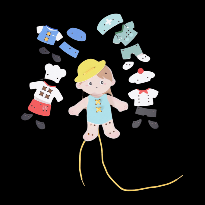 Viste a la niña de madera con distintas piezas de ropa mediante lazos. Puedes combinar sombreros, camisetas, pantalones y zapatos para vestirla según distintas profesiones. Desarrolla la motricidad fina y es muy útil para aprender la técnica necesaria para posteriormente saber atarse los cordones de los zapatos.