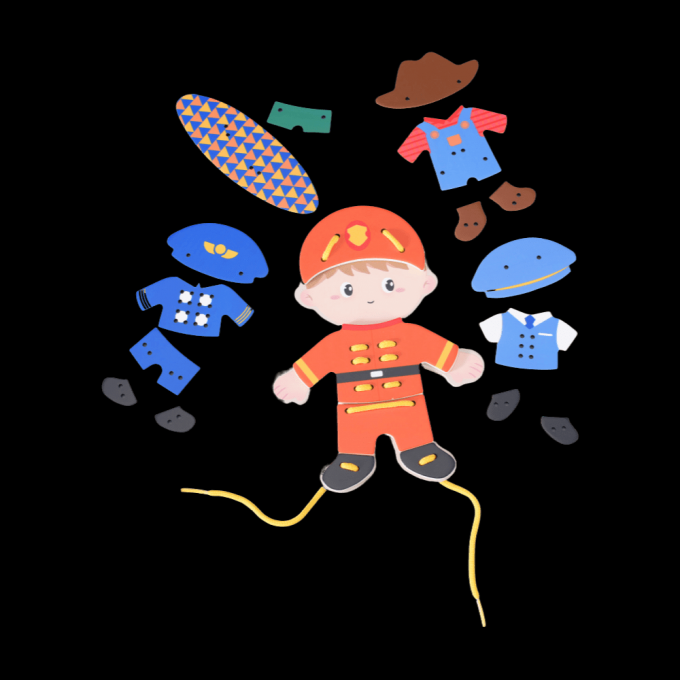 Viste al niño de madera con distintas piezas de ropa mediante lazos. Puedes combinar sombreros, camisetas, pantalones y zapatos para vestirlo según distintas profesiones. Desarrollar la motricidad fina y es muy útil para aprender la técnica necesaria para posteriormente saber atarse los cordones de los zapatos.