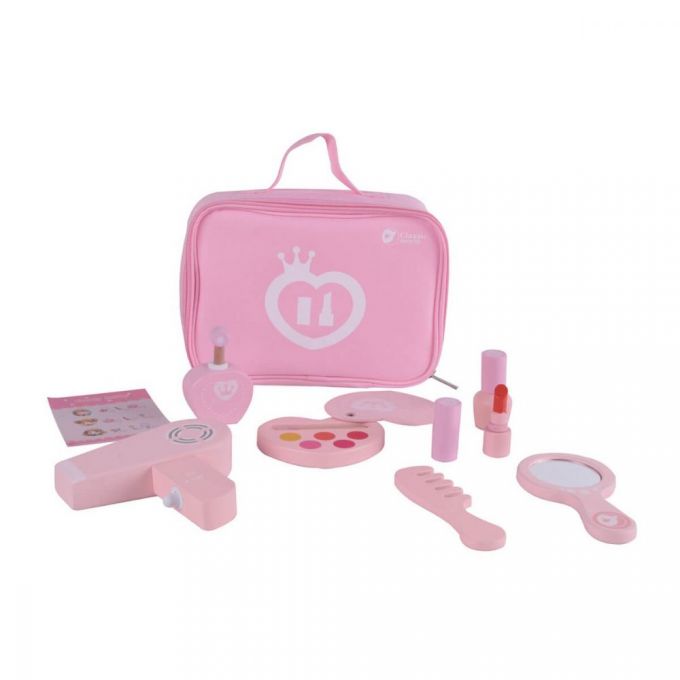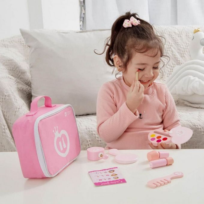 El set de maquillaje es un juguete que permite jugar a maquillarse. Incluye 12 elementos de madera como son: 1 paleta de sombras de ojos con un pincel en el interior, 1 barra de labios, 1 botella de esmalte de uñas, 1 botella de perfume, 1 espejo, 1 peine, 1 secador de pelo..., más una tarjeta con instrucciones de maquillaje. Todo ello lo podrás colocar en un bonito maletín para facilitar el transporte de este set. Estimula la imaginación y desarrolla la motricidad fina.