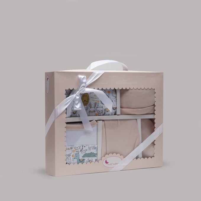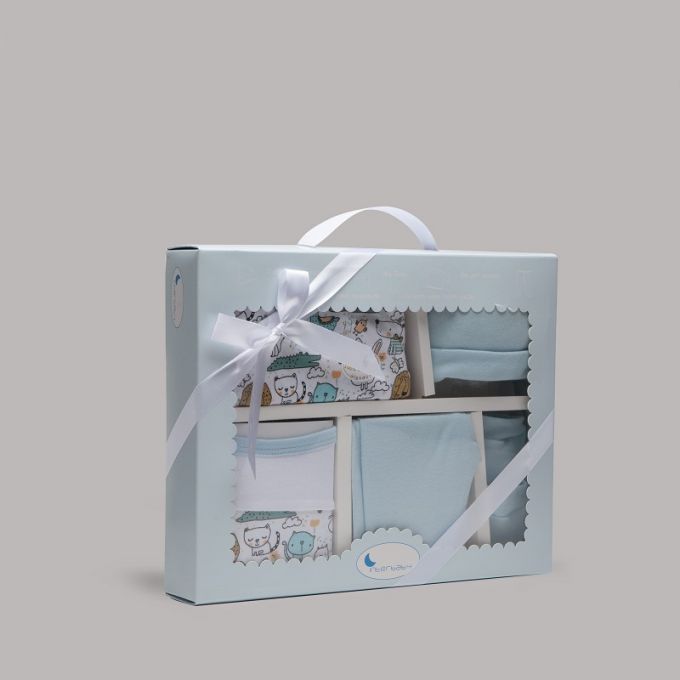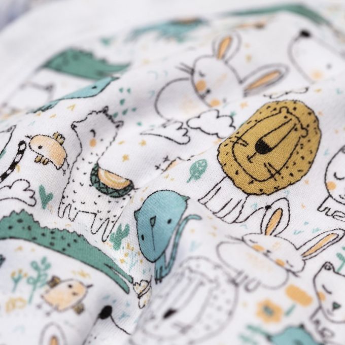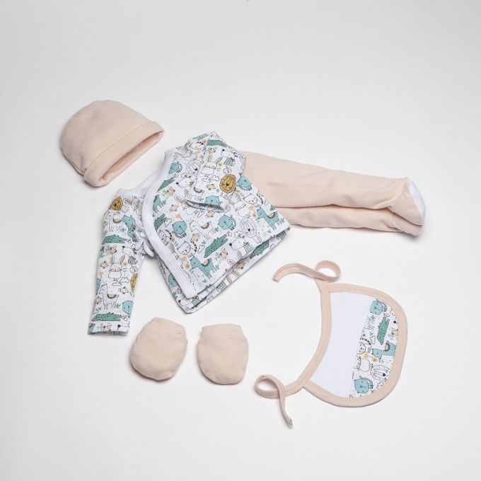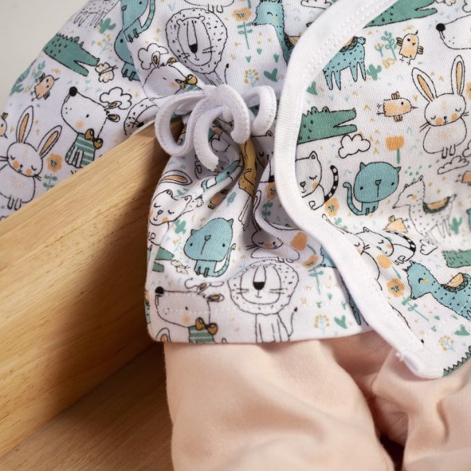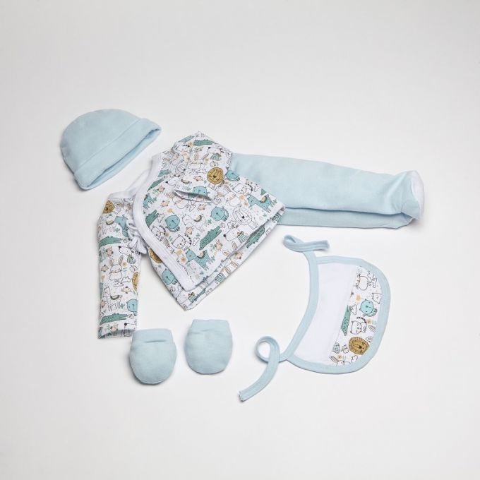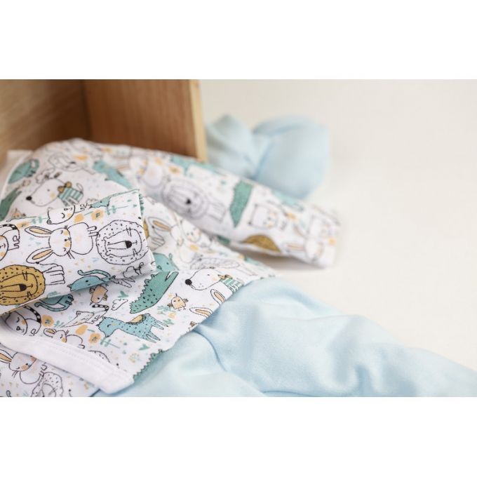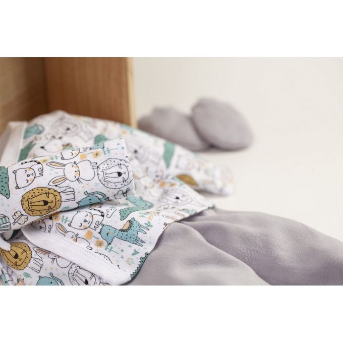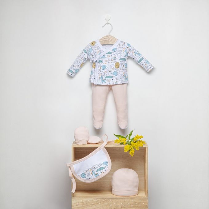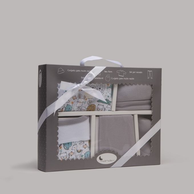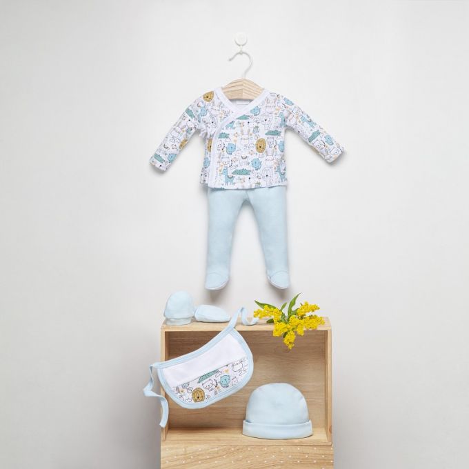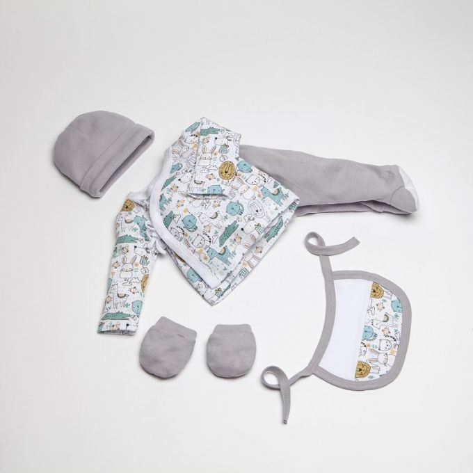 Conjunto de 5 piezas de la Colección Animalitos ideal para regalar. Estampados originales y divertidos para que tu Bebé descubra sus primeros días en un mundo de fantasía.
