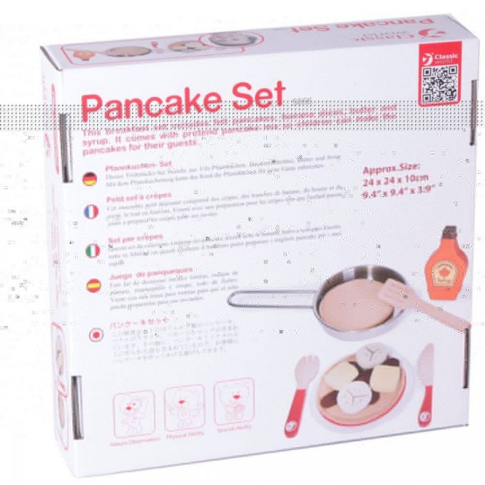 El set de tortitas o pancakes incluye: los pancakes de fieltro, así como rodajas de plátano, mantequilla y almíbar y los utensilios para cocinarlos y comerlos; sartén, cubiertos.