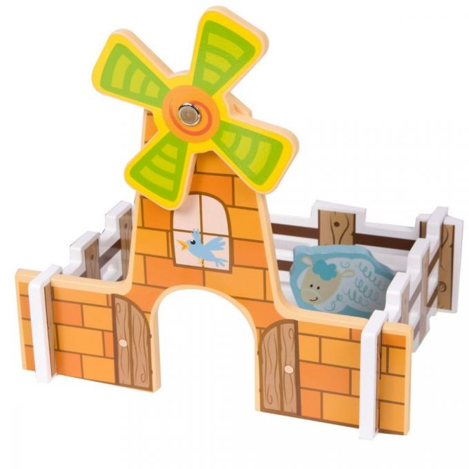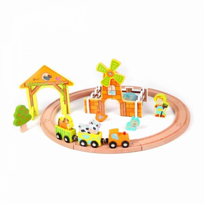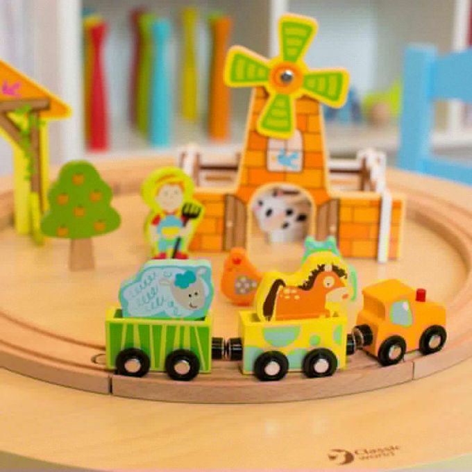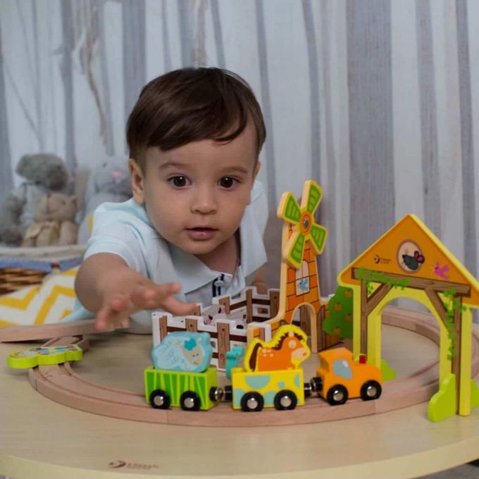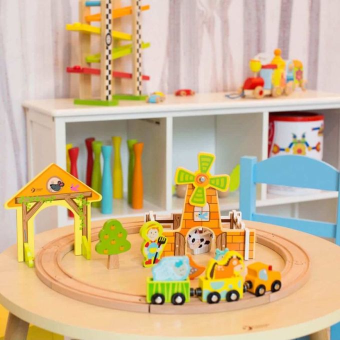 El set de tren granja es un tren que recorre la finca sobre las vías. Incluye distintas piezas de madera como 1 locomotora, 2 vagones sujetos por imanes, además de distintas figuras de animales de la granja, un molino etc.