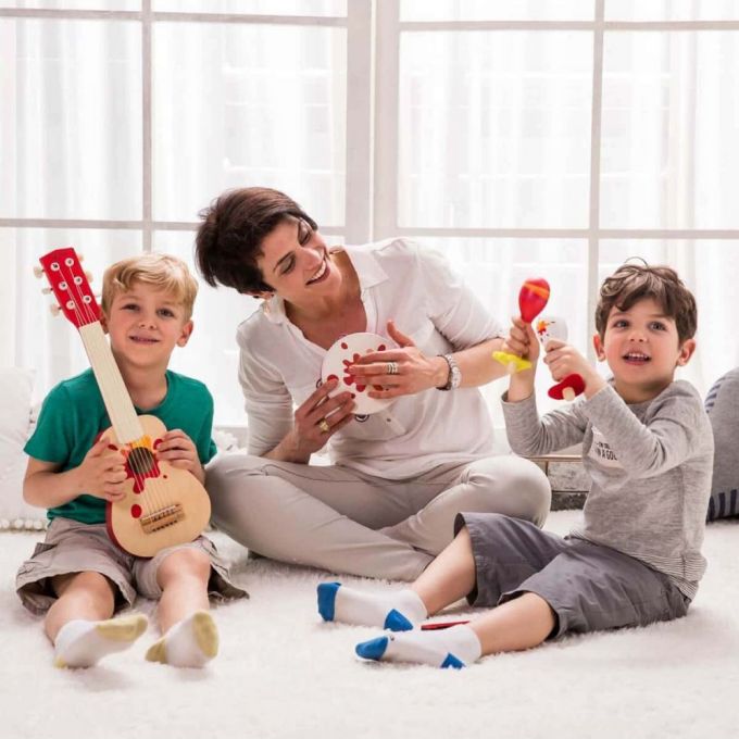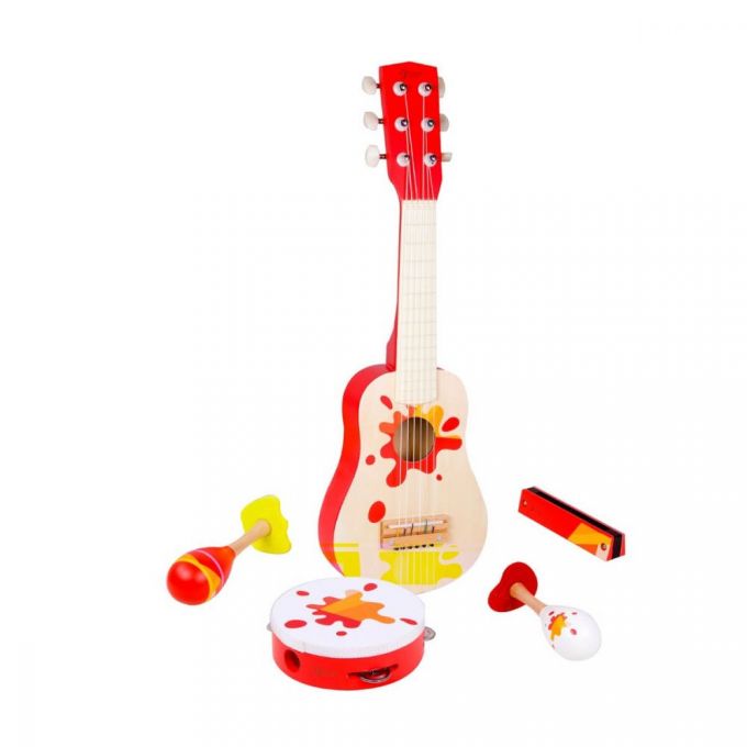 El set musical estrella es un fabuloso set de música de tamaño adecuado para l@s peques. El juego incluye: xilófono, flauta, pandereta y castañuelas. Invita a tus amig@s a formar parte de la banda y ofrece un concierto.