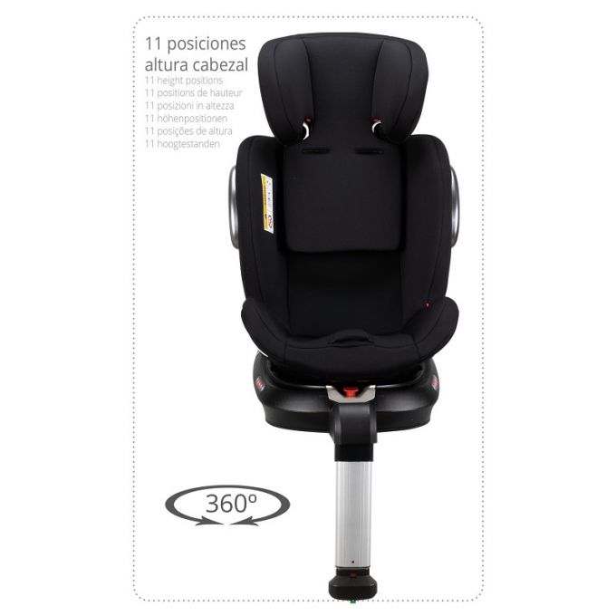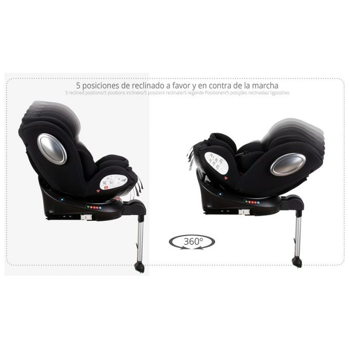 Dispone de 5 posiciones de reclinado a favor en contra de la marcha reductor de cuerpo y cabeza para los grupos 0 y 1. El reposacabezas es regulable en altura.